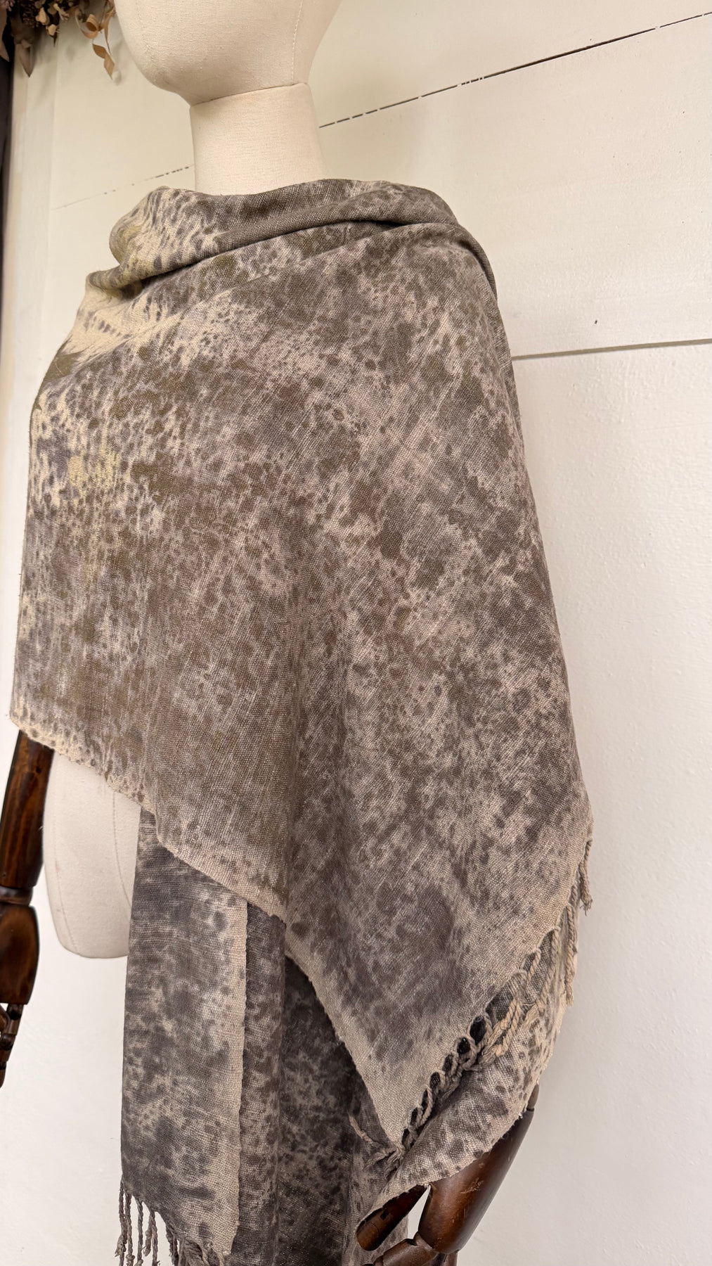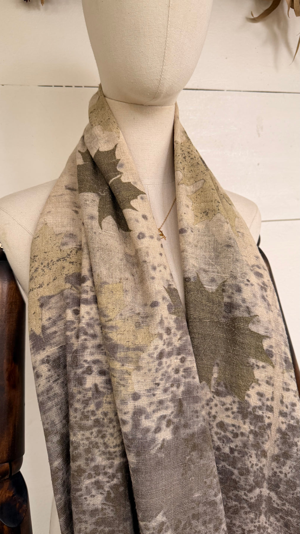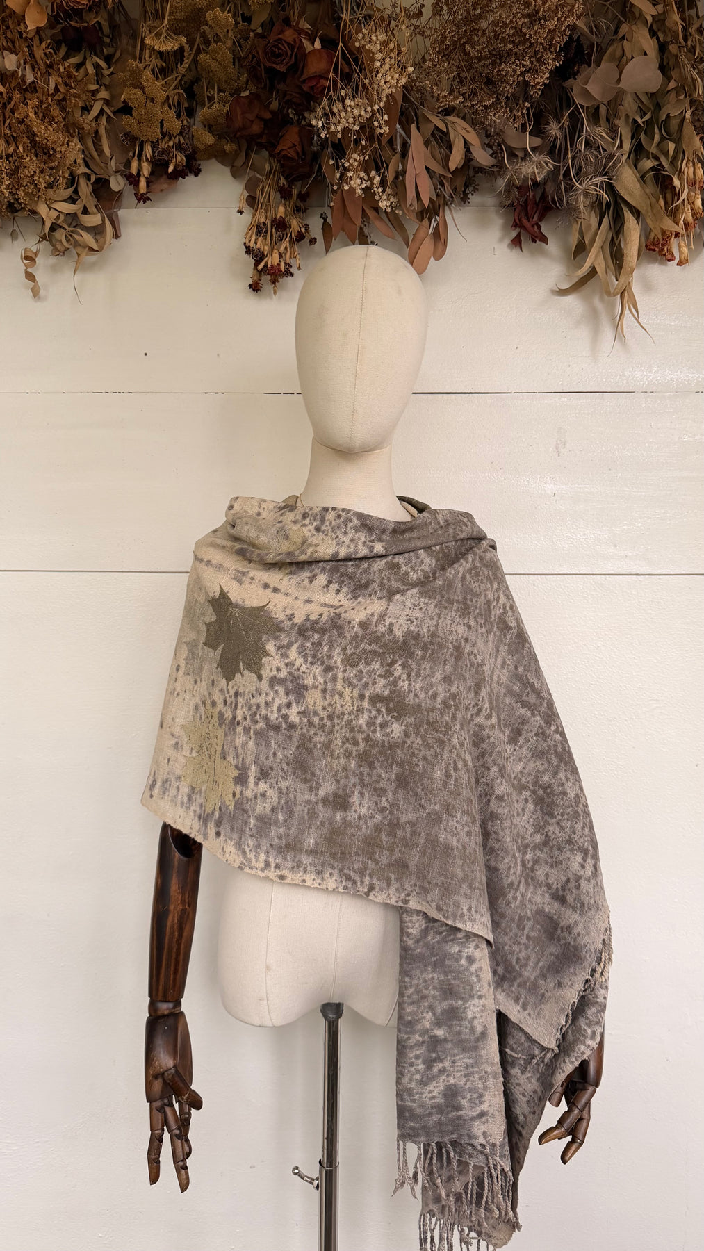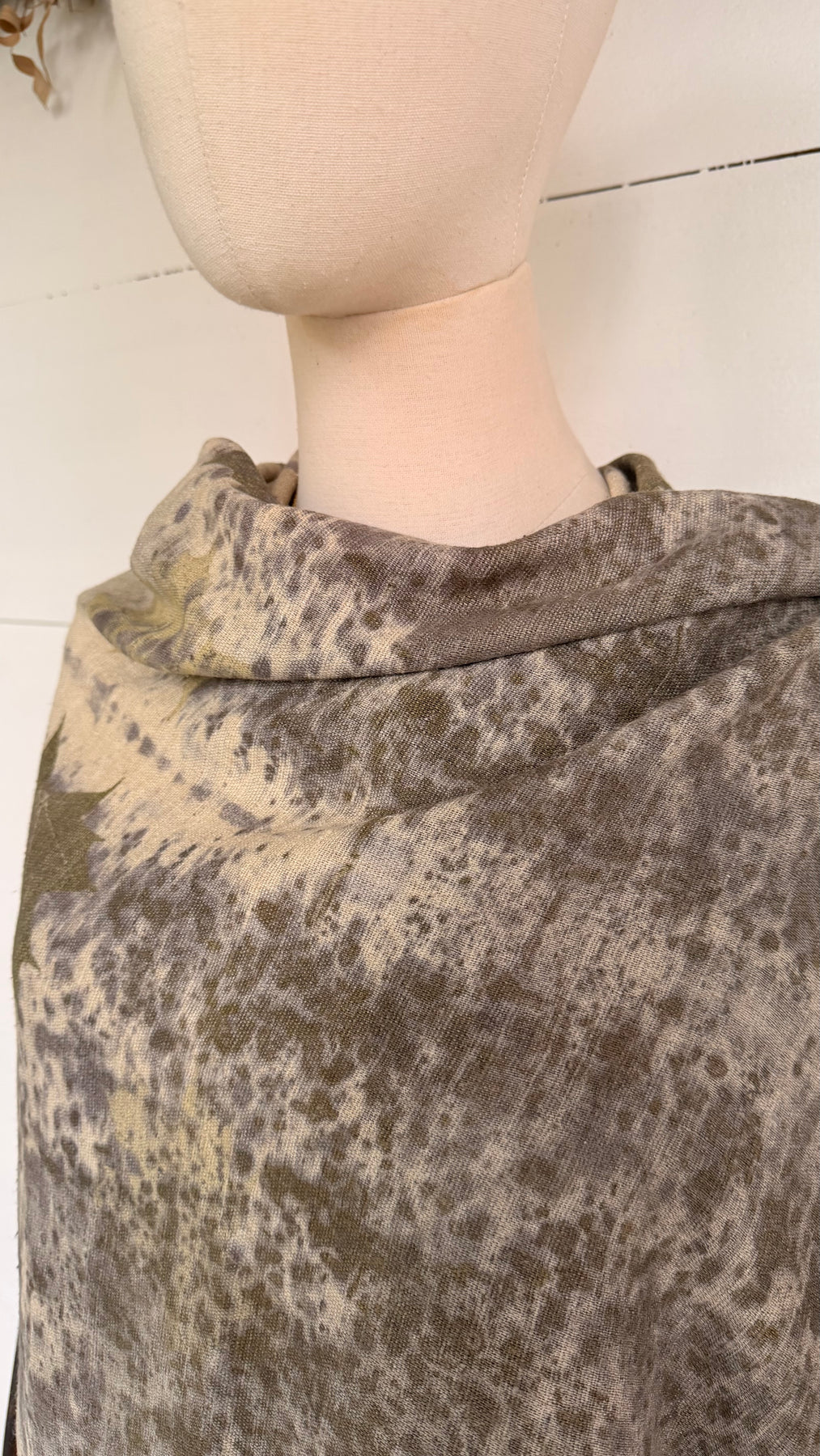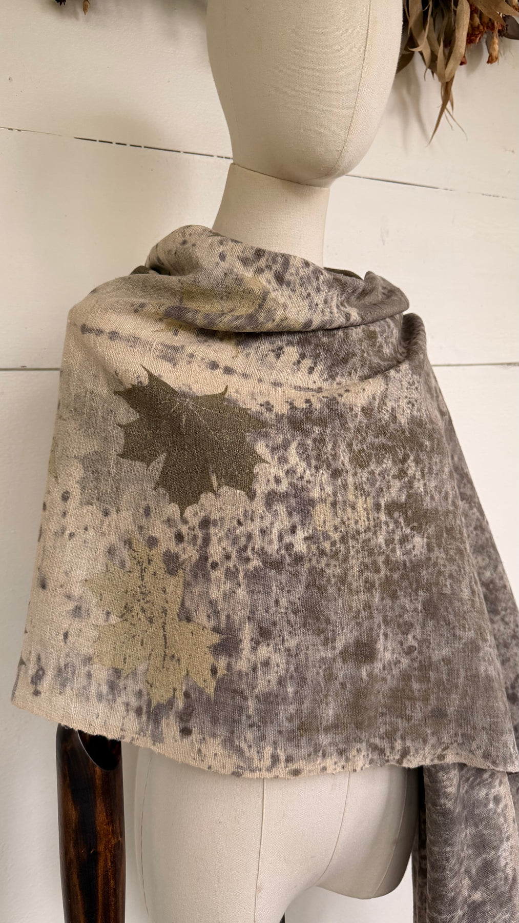 The Gaia Collection features medium-weight wild silk scarves and ponchos, eco-printed by hand in Scarabajo Studio using real botanical elements. The organic texture of wild silk adds structure and character, while slow eco-printing creates one-of-a-kind botanical patterns and natural color variation.