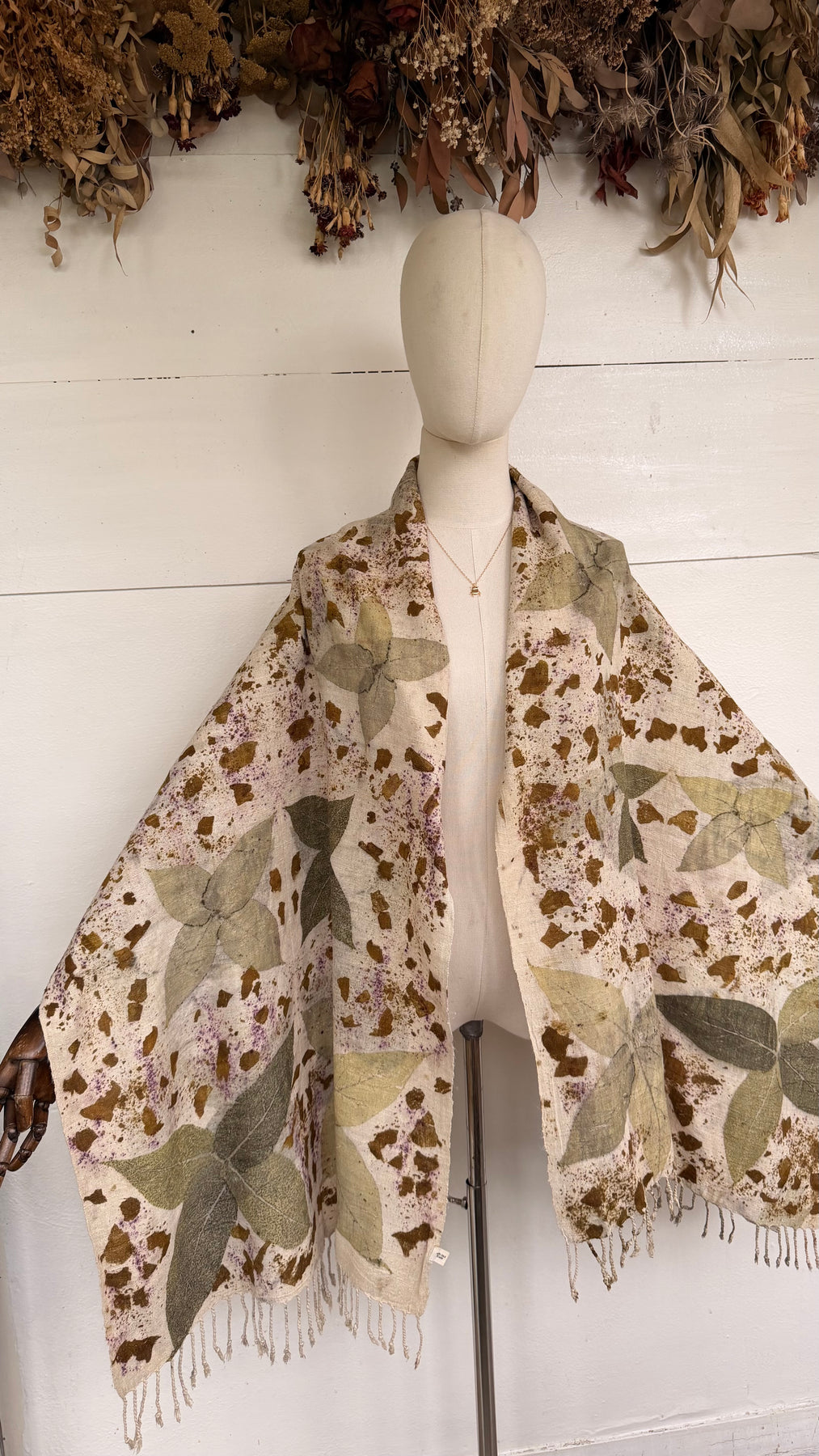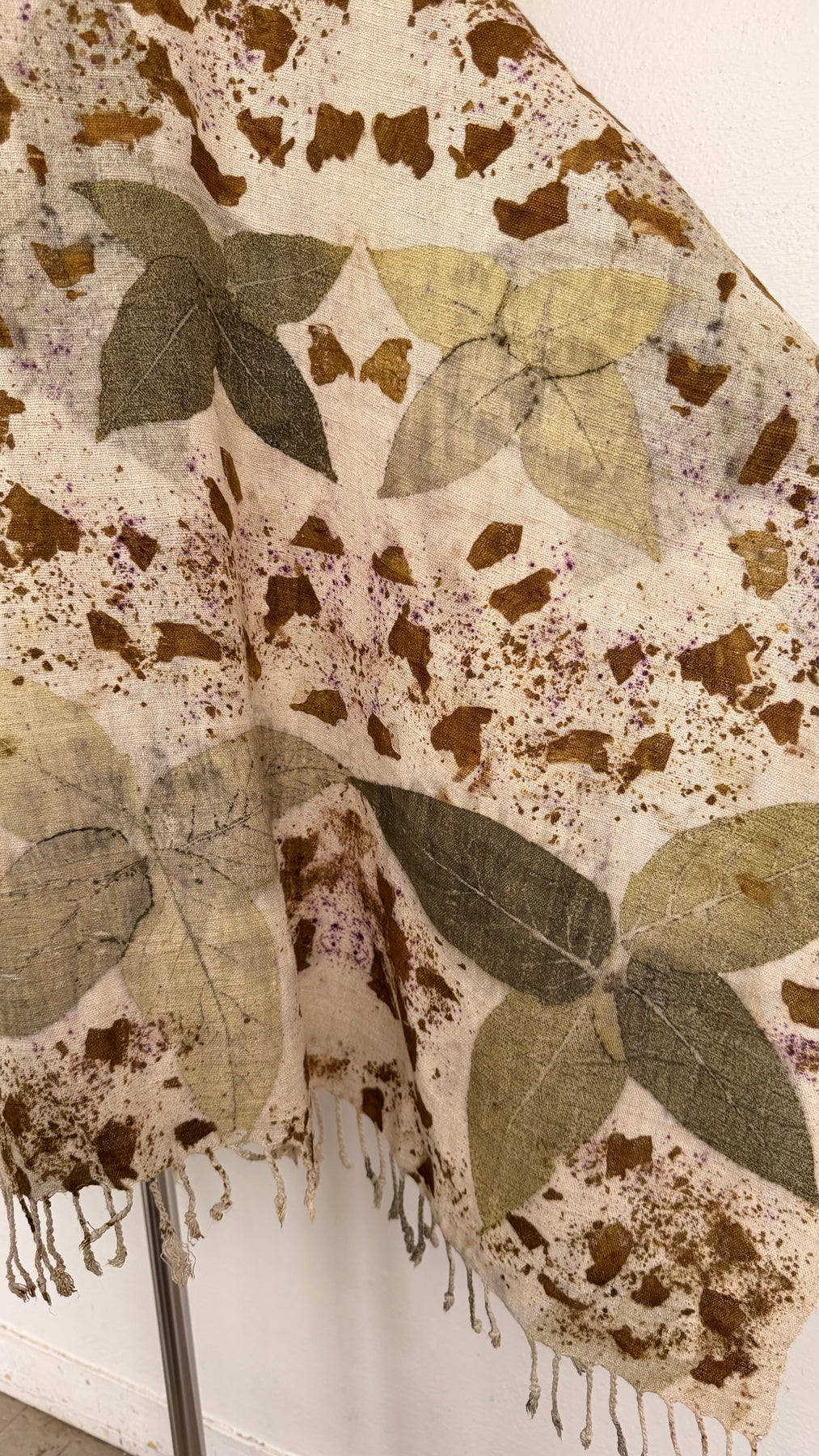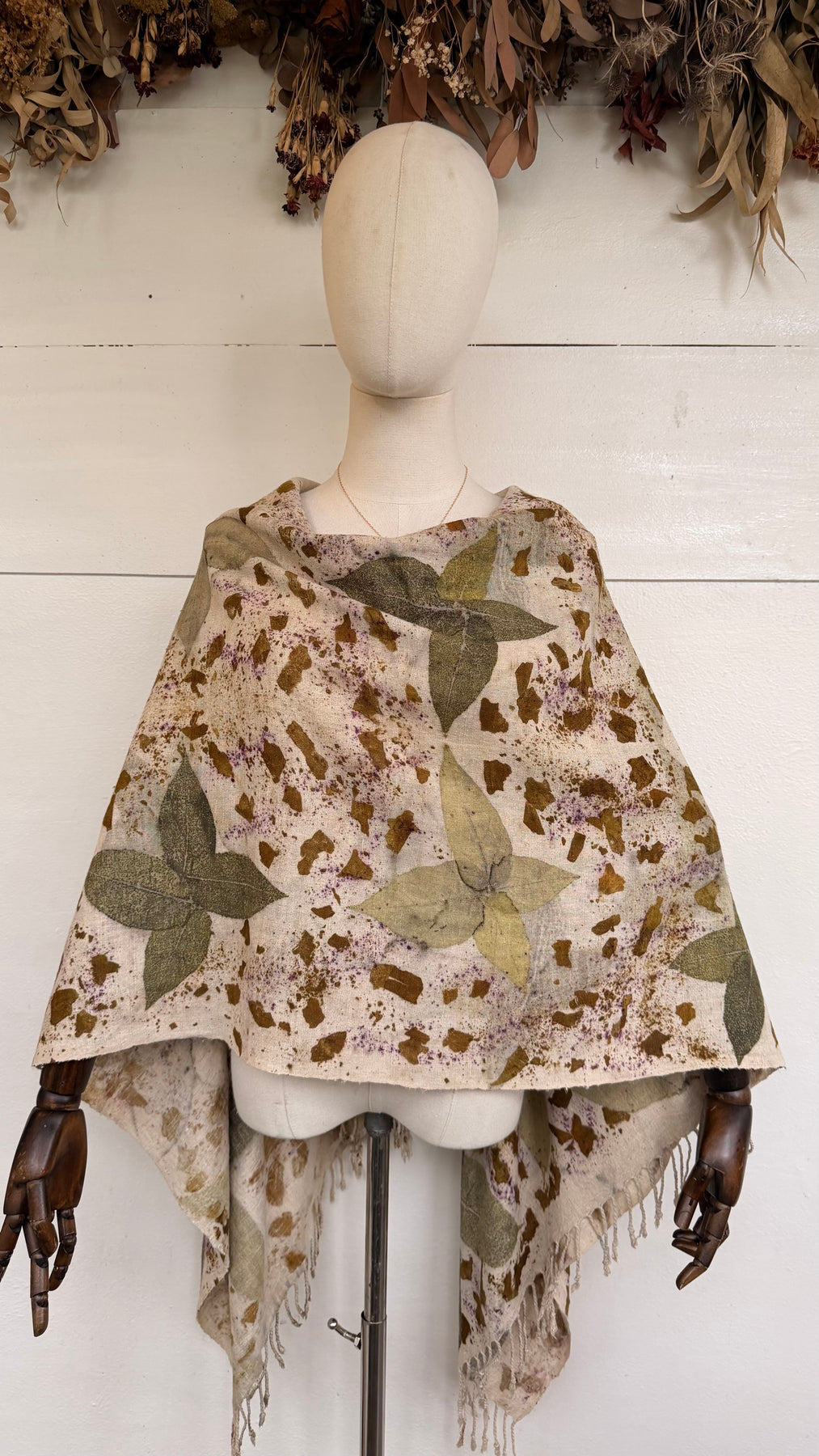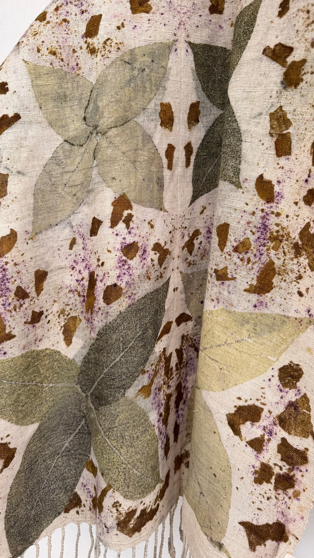 The Gaia Collection features medium-weight wild silk scarves and ponchos, eco-printed by hand in Scarabajo Studio using real botanical elements. The organic texture of wild silk adds structure and character, while slow eco-printing creates one-of-a-kind botanical patterns and natural color variation.