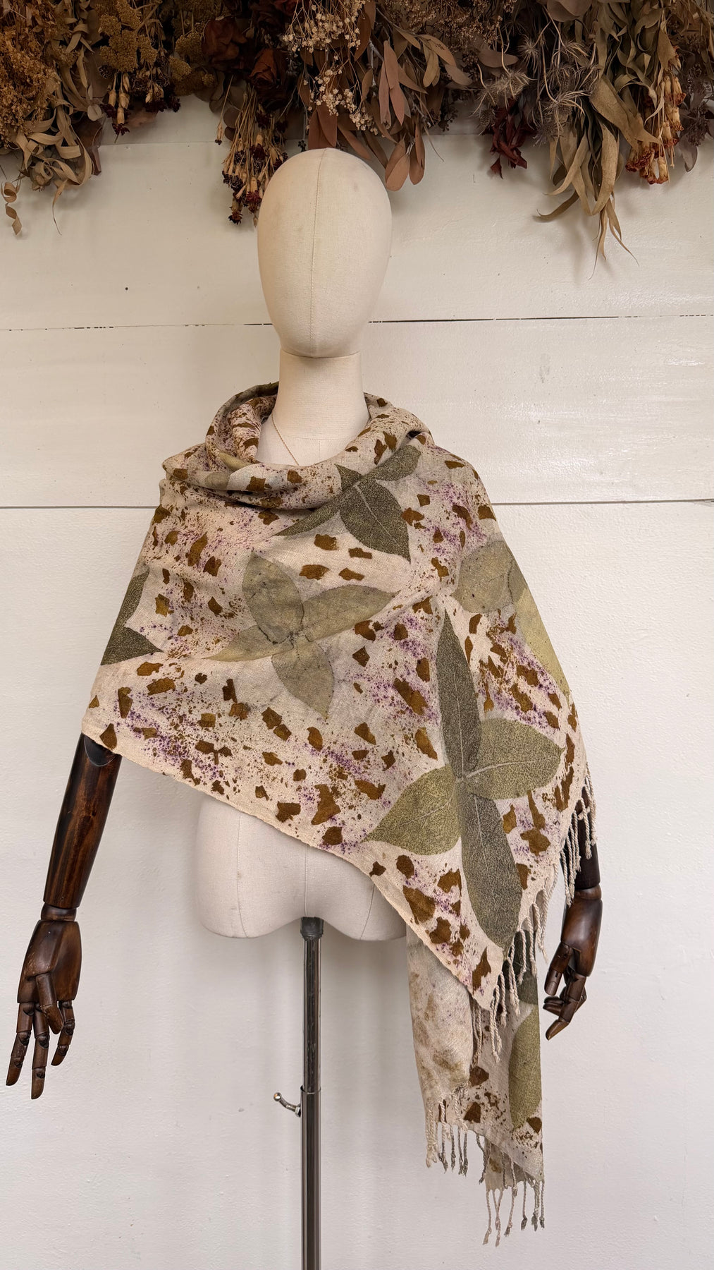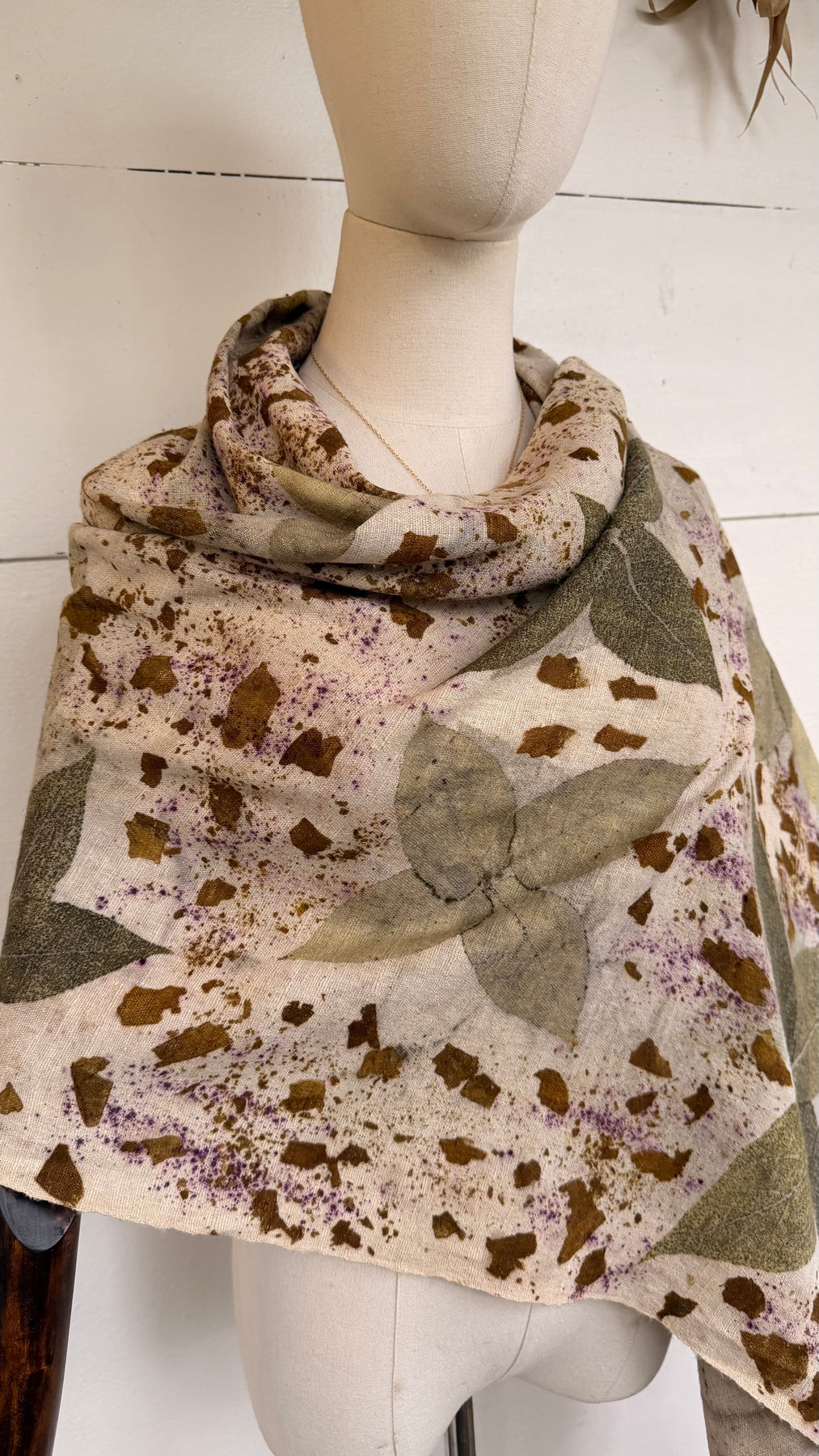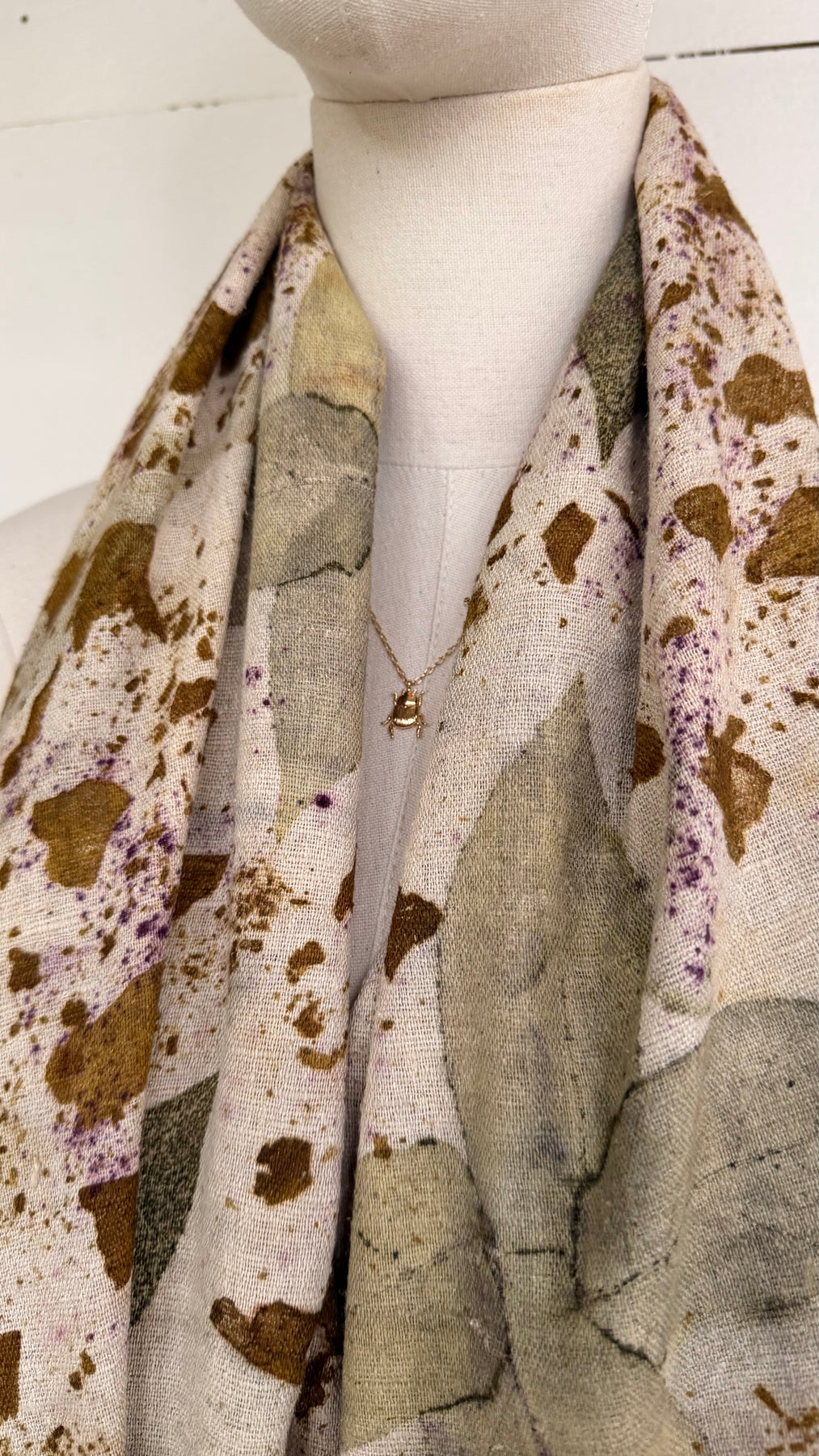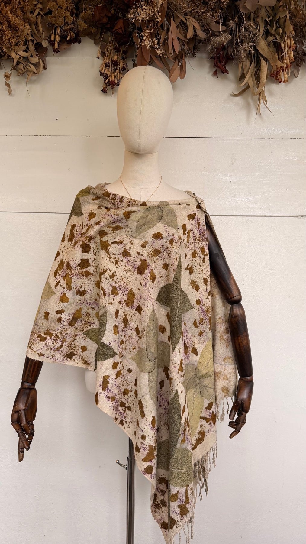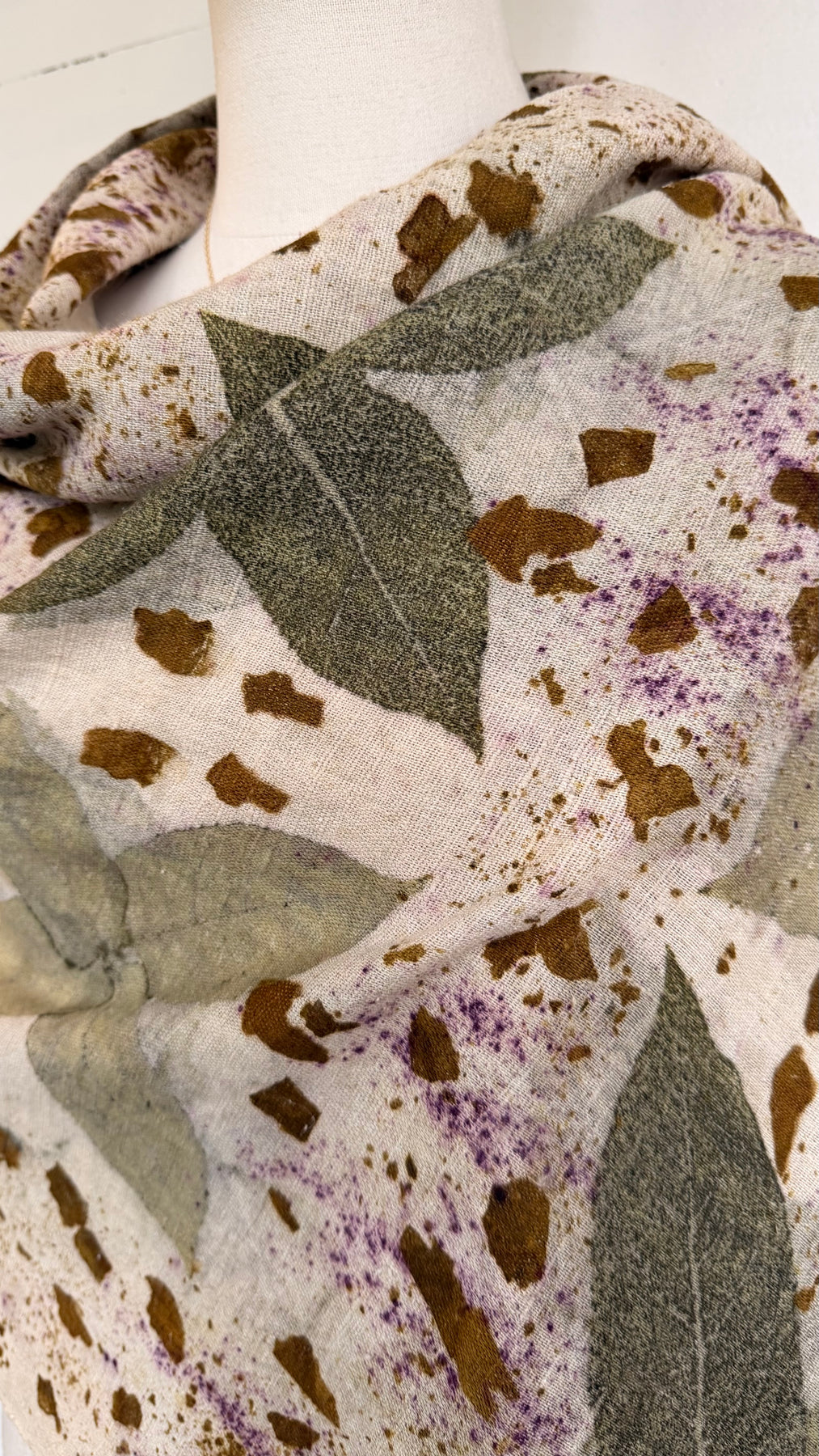The Gaia Collection features medium-weight wild silk scarves and ponchos, eco-printed by hand in Scarabajo Studio using real botanical elements. The organic texture of wild silk adds structure and character, while slow eco-printing creates one-of-a-kind botanical patterns and natural color variation.