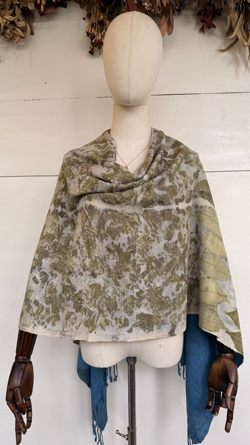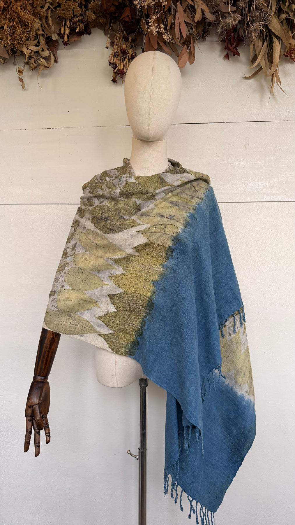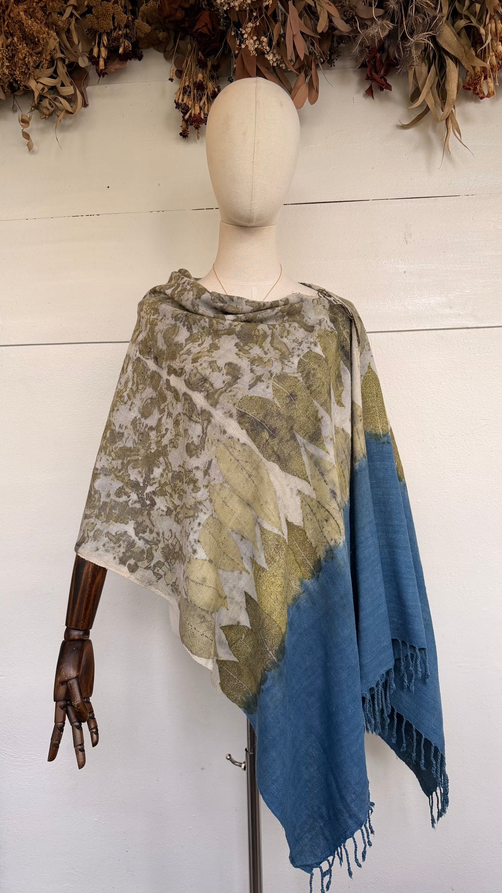 The Gaia Collection features medium-weight wild silk scarves and ponchos, eco-printed by hand in Scarabajo Studio using real botanical elements. The organic texture of wild silk adds structure and character, while slow eco-printing creates one-of-a-kind botanical patterns and natural color variation.