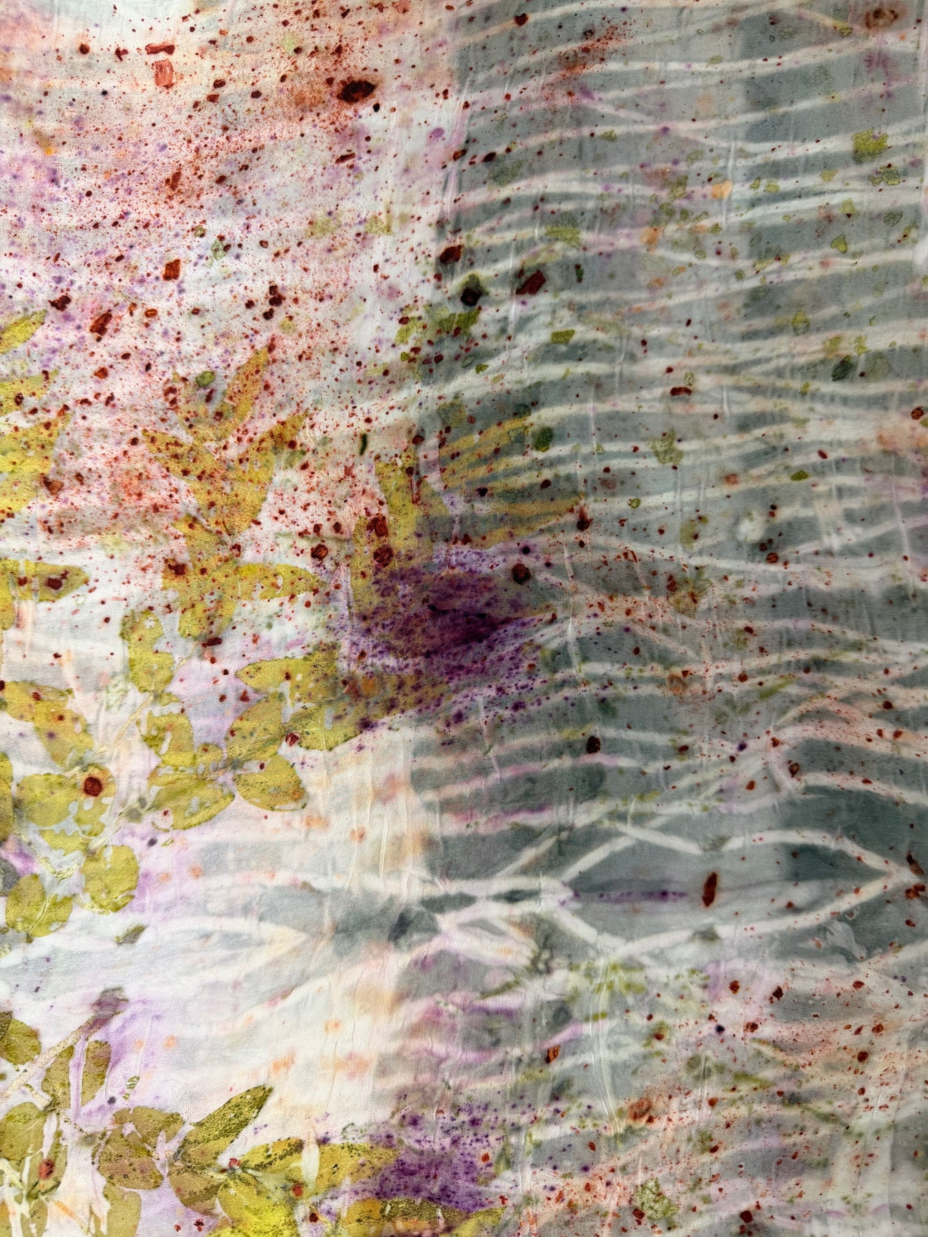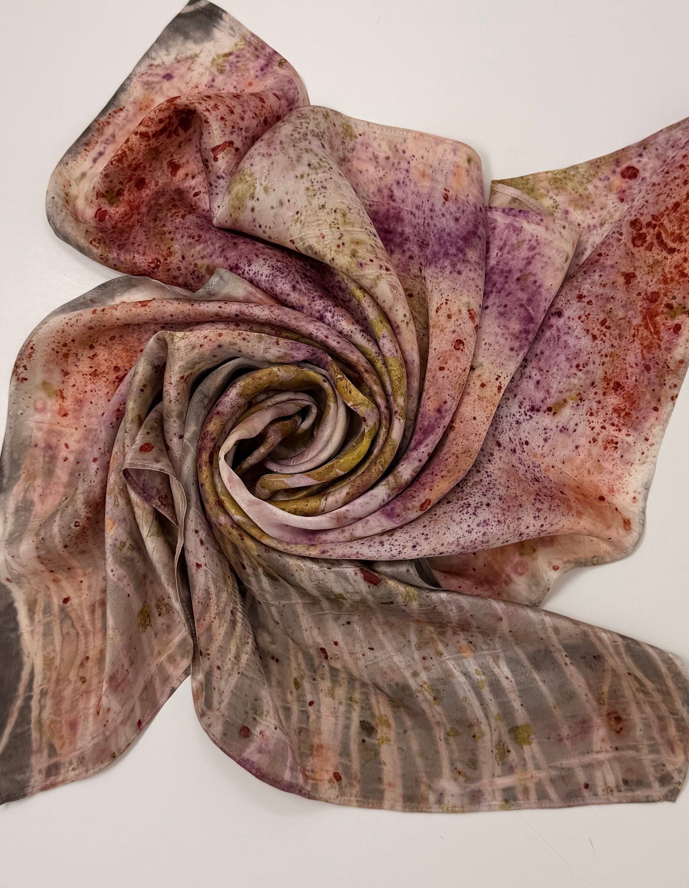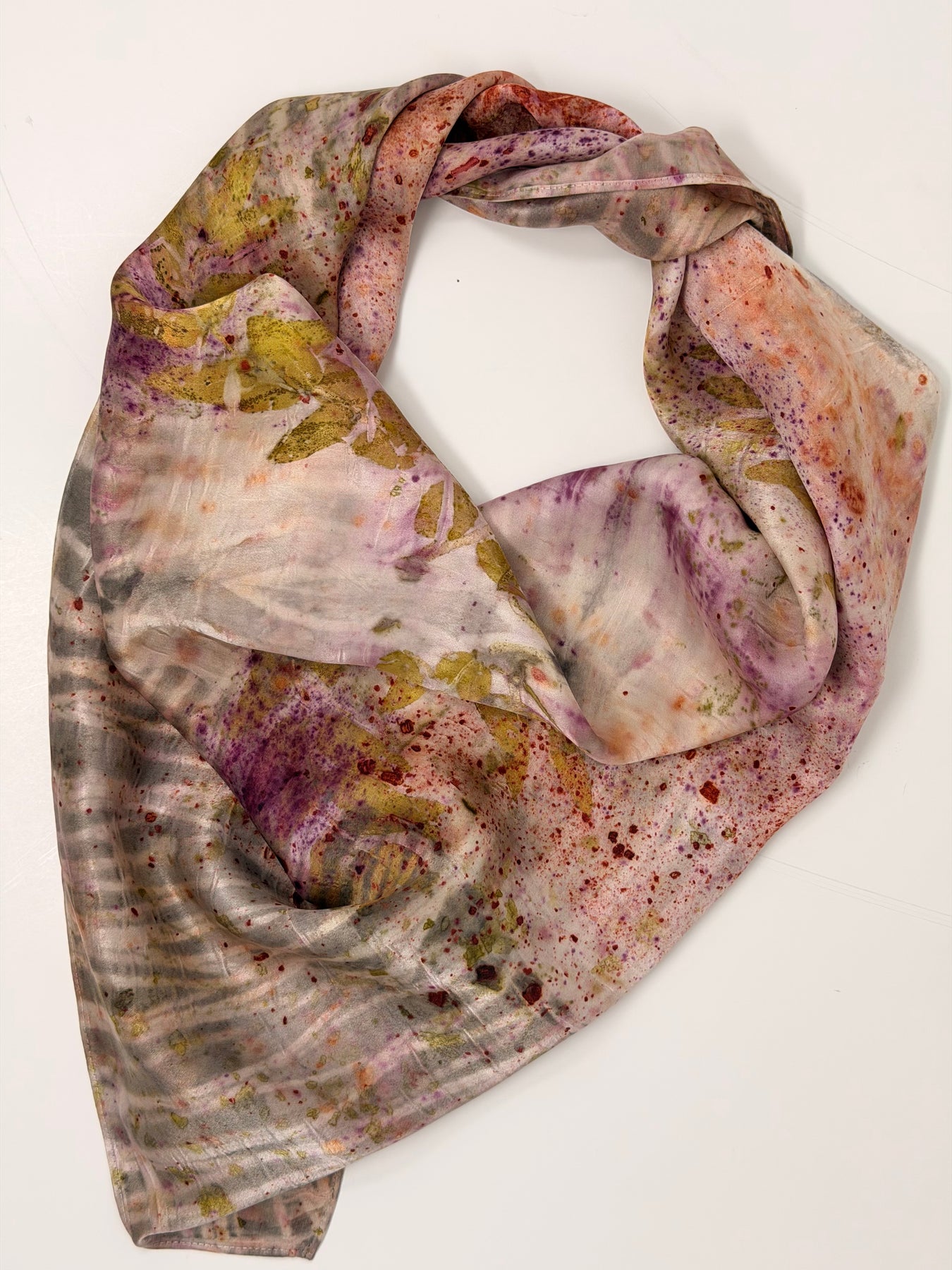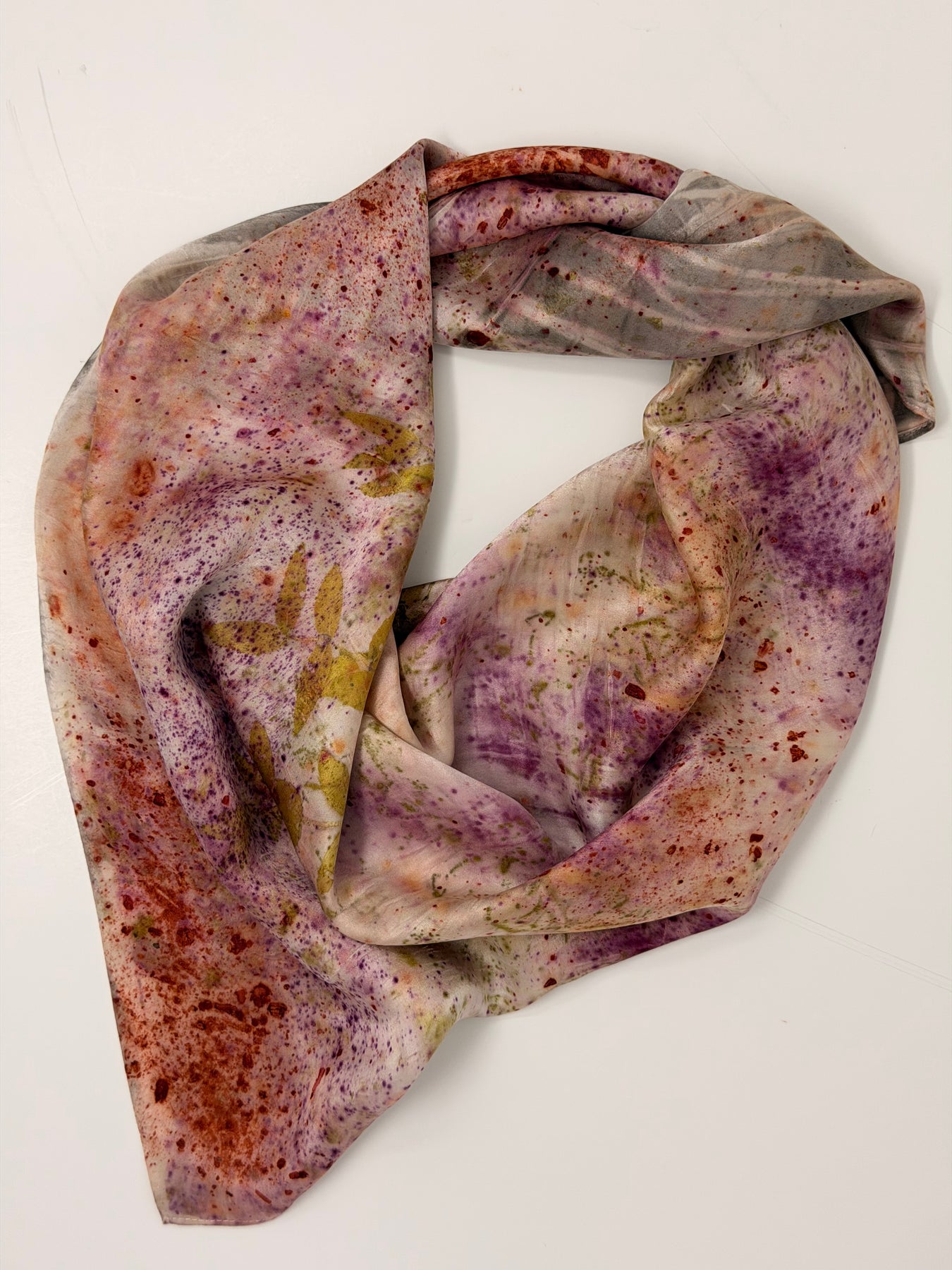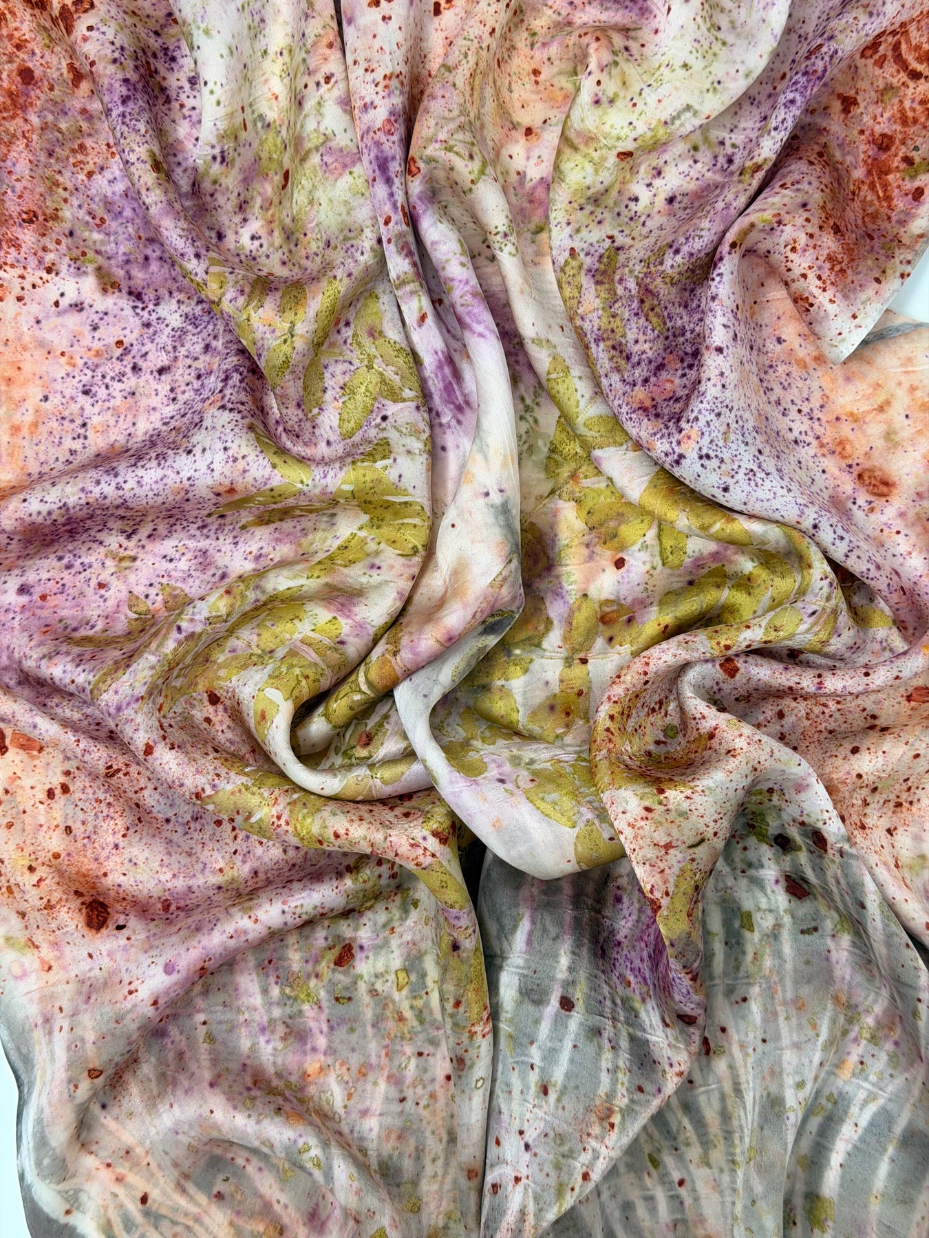 A one-of-a-kind Ecoprinted silk scarf from our Memora collection. Each piece is unique, made with botanical dyes to capture the beauty of nature in color and pattern.