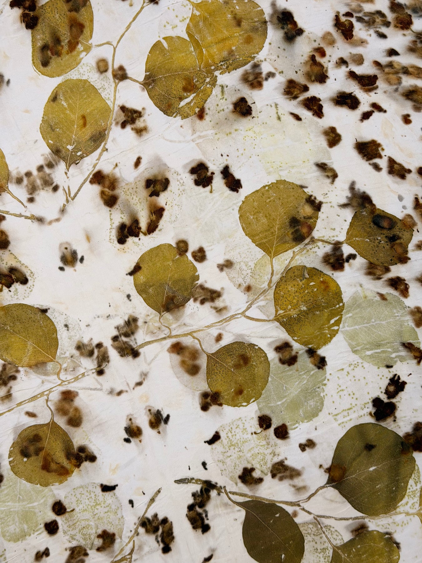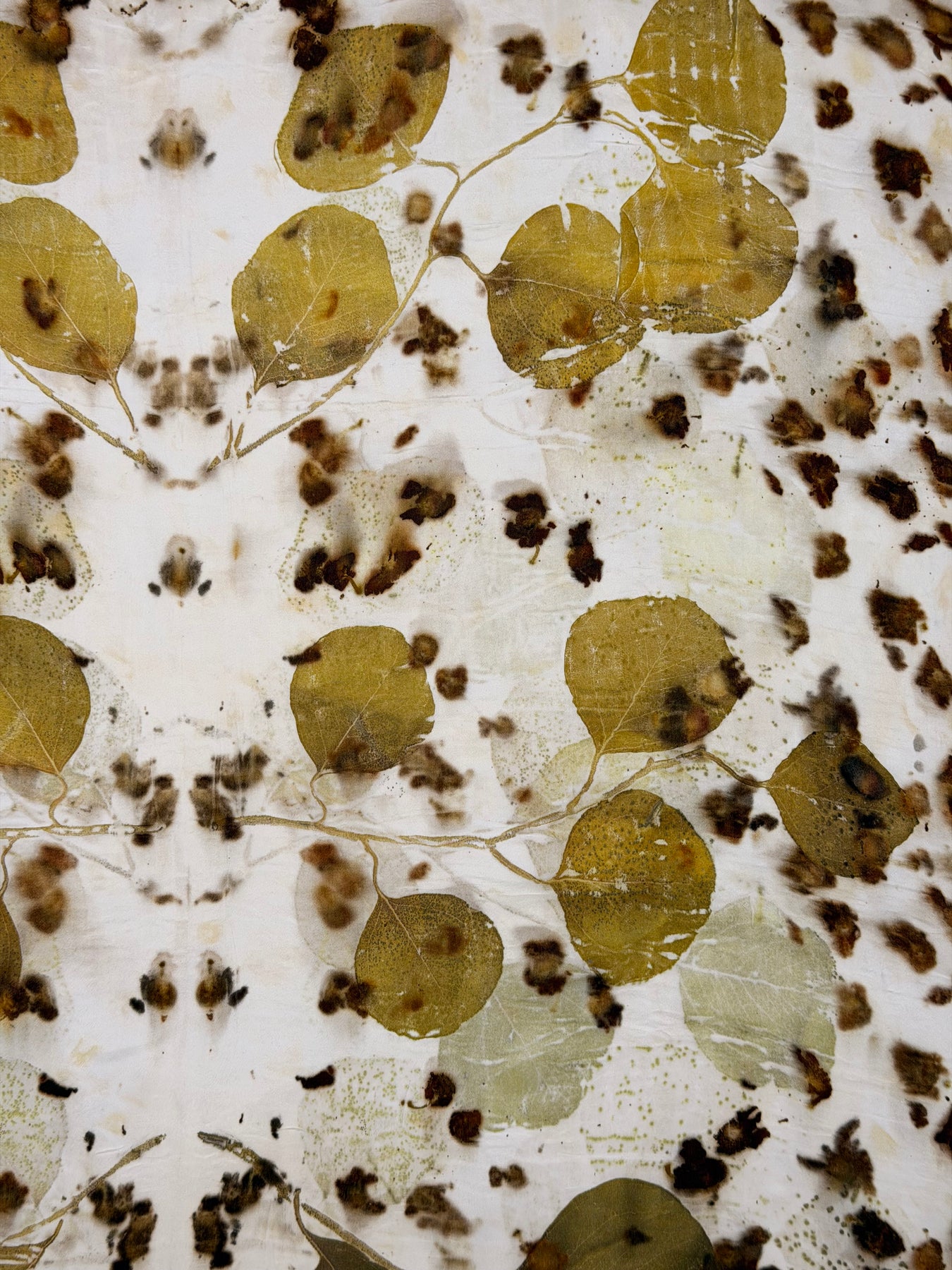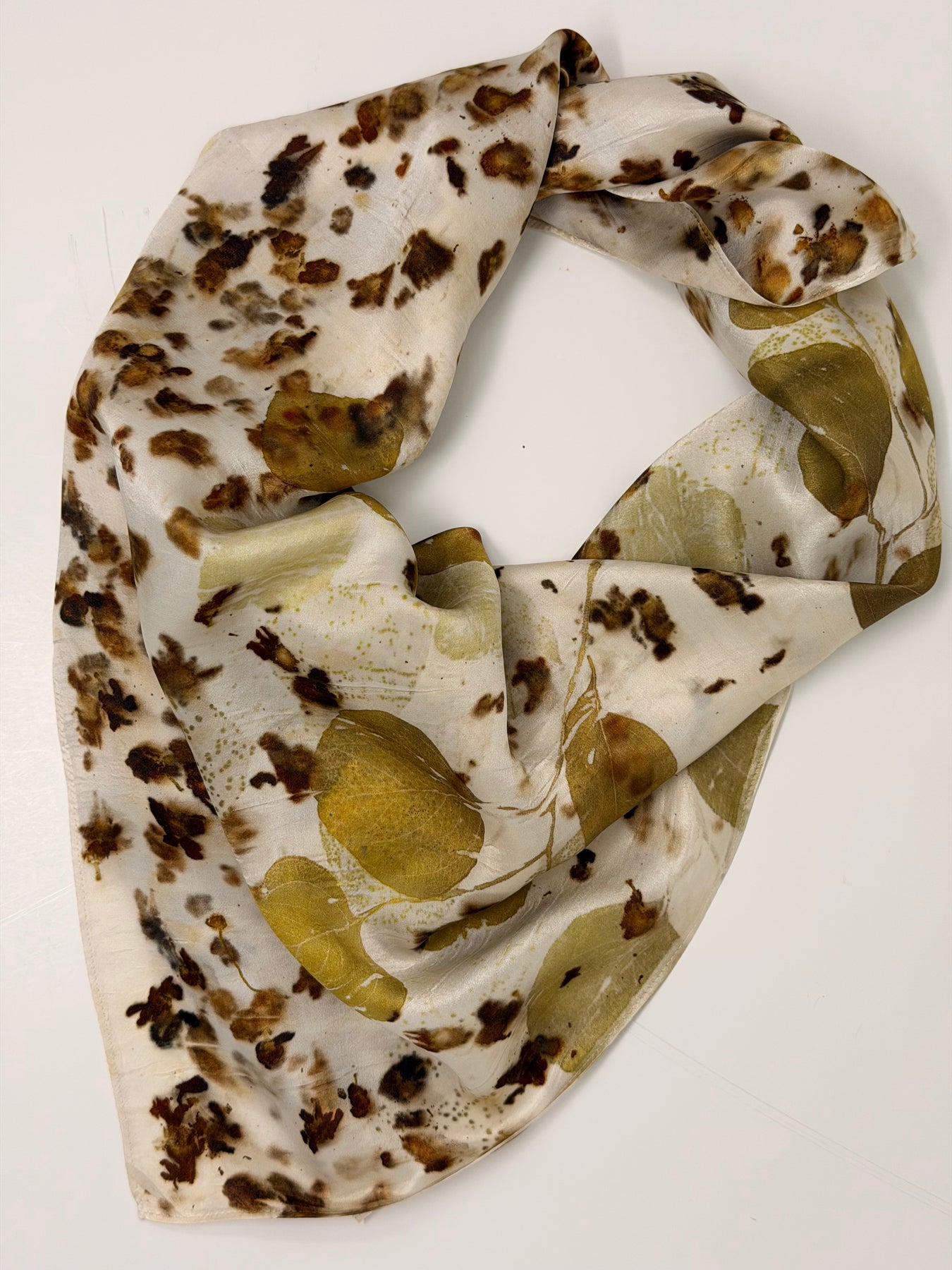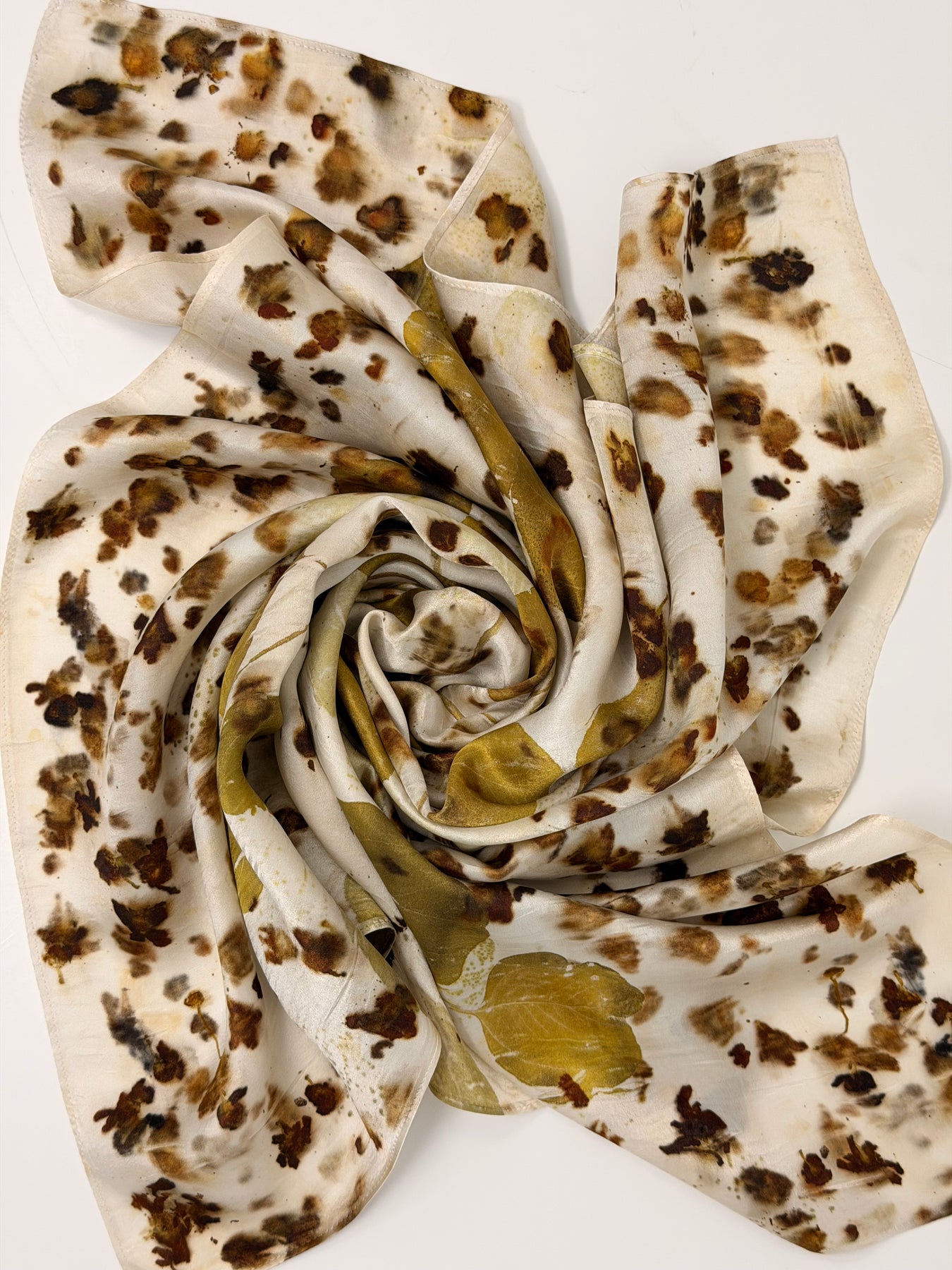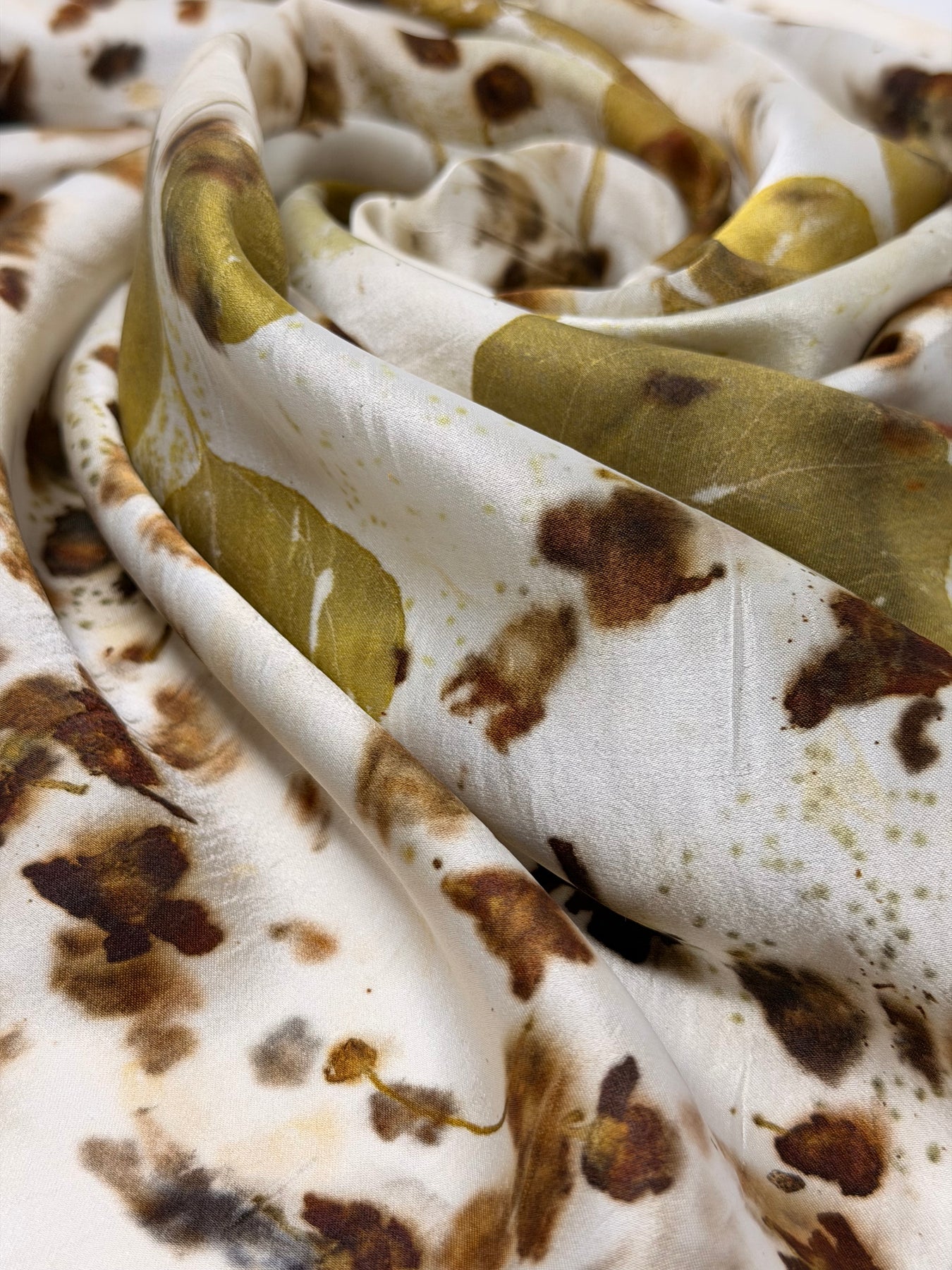 A one-of-a-kind Ecoprinted silk scarf from our Memora collection. Each piece is unique, made with botanical dyes to capture the beauty of nature in color and pattern.