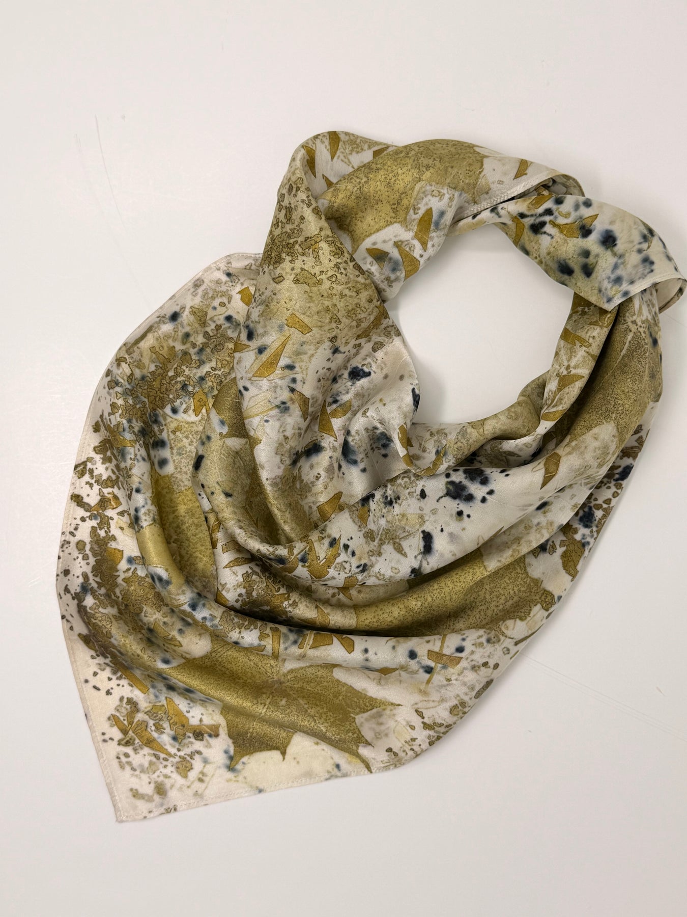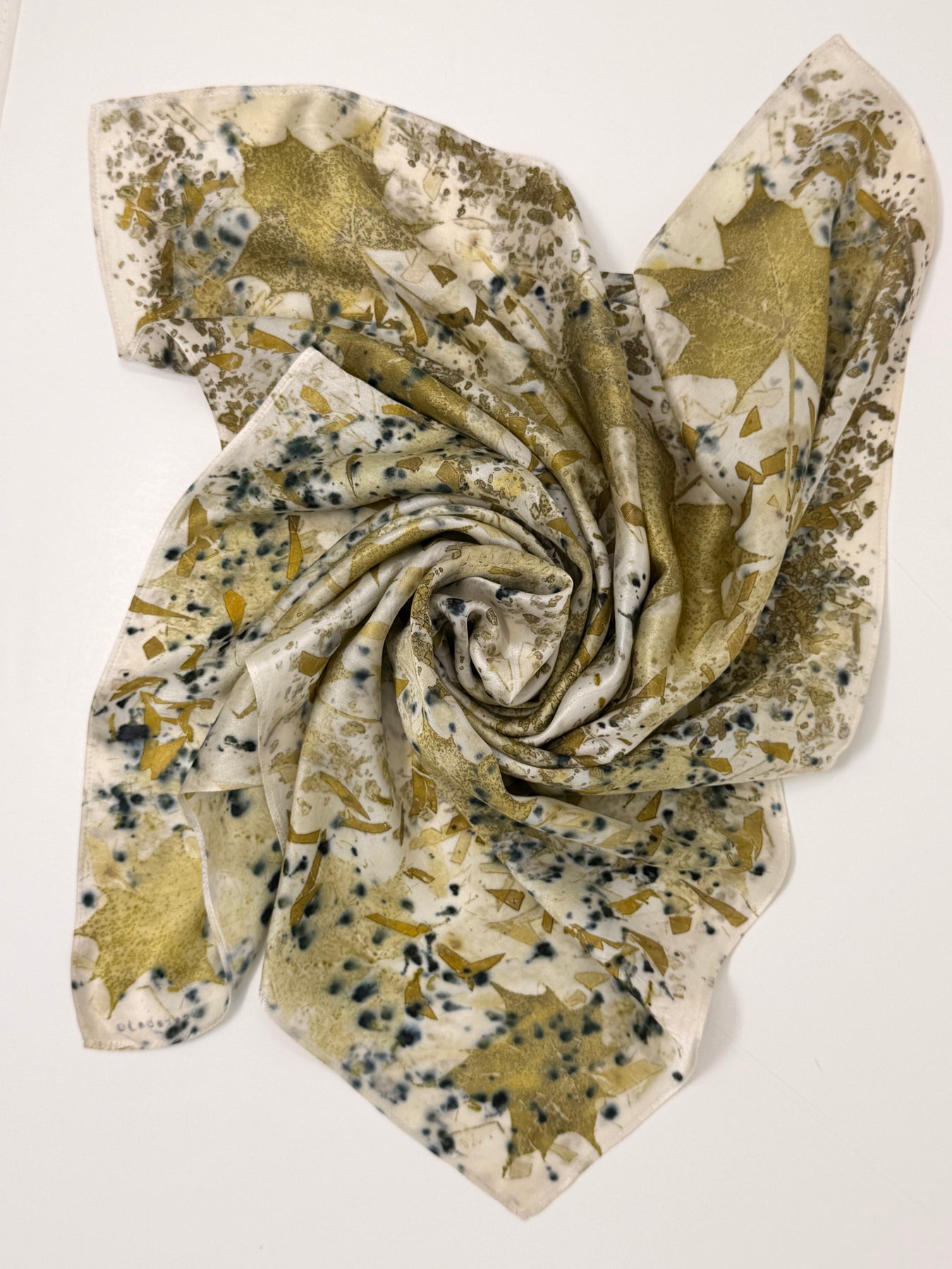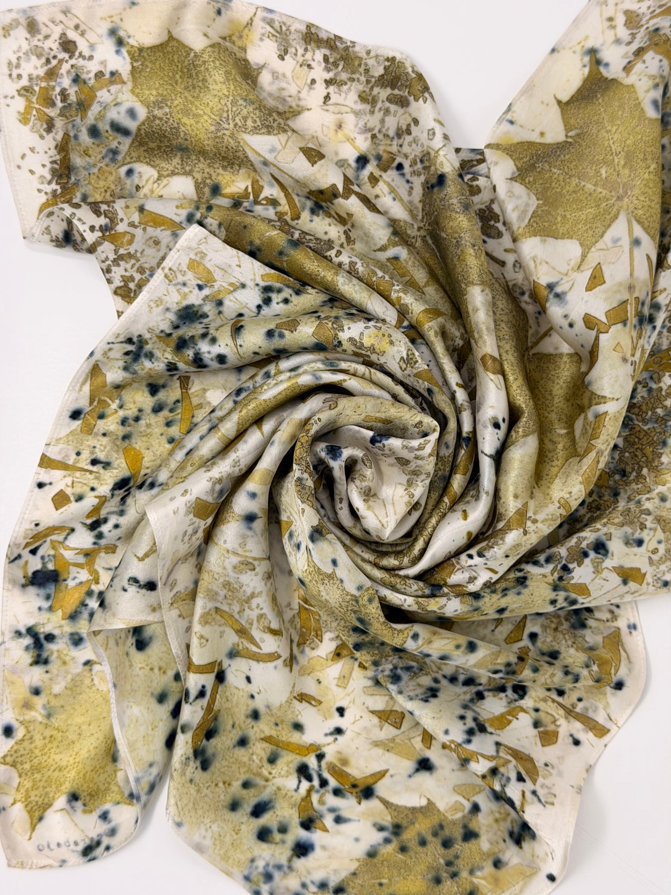 A one-of-a-kind Ecoprinted silk scarf from our Memora collection. Each piece is unique, made with botanical dyes to capture the beauty of nature in color and pattern.