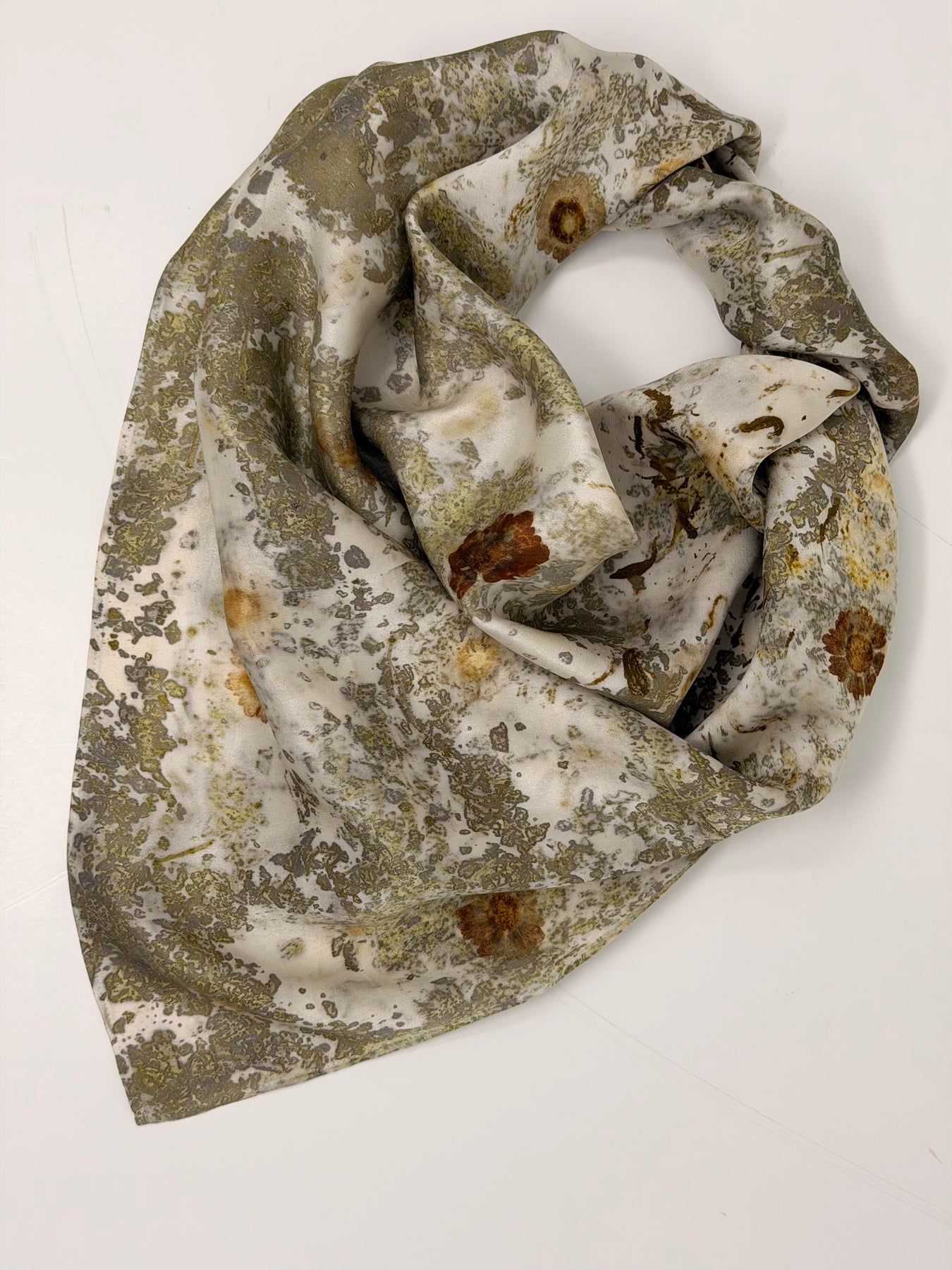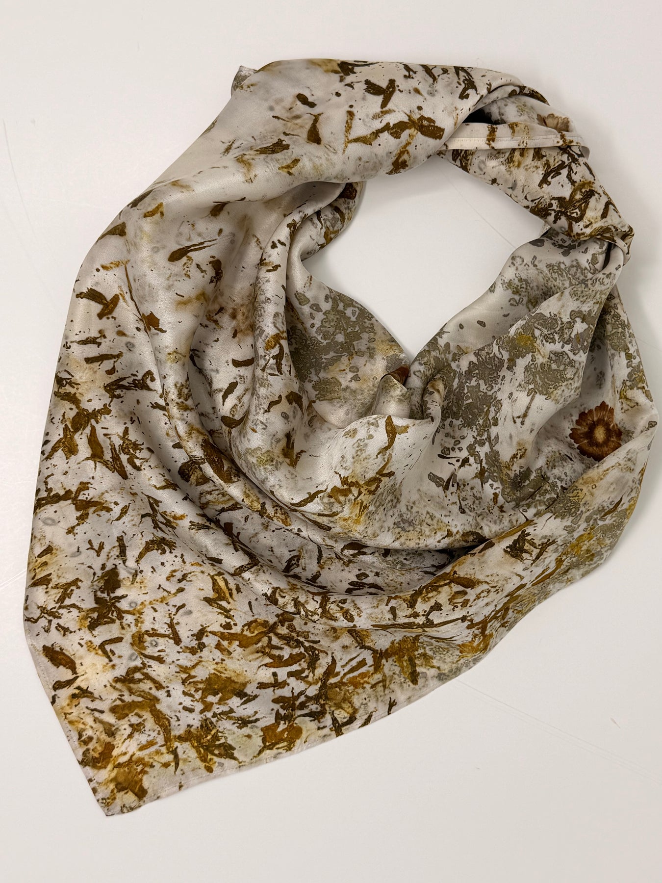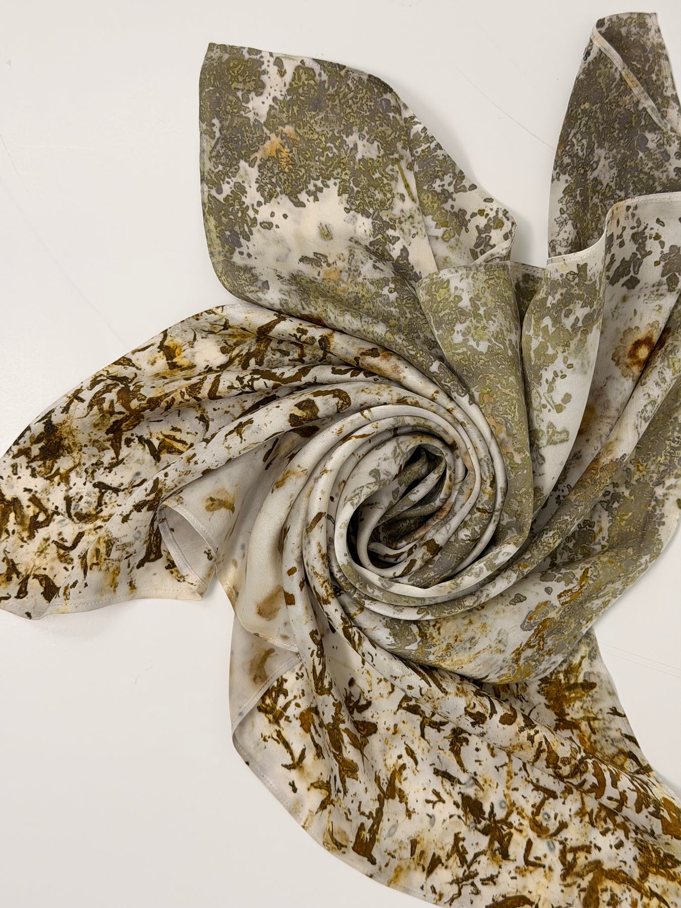 A one-of-a-kind Ecoprinted silk scarf from our Memora collection. Each piece is unique, made with botanical dyes to capture the beauty of nature in color and pattern.