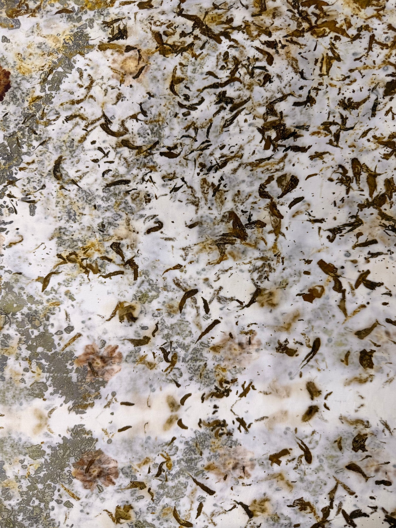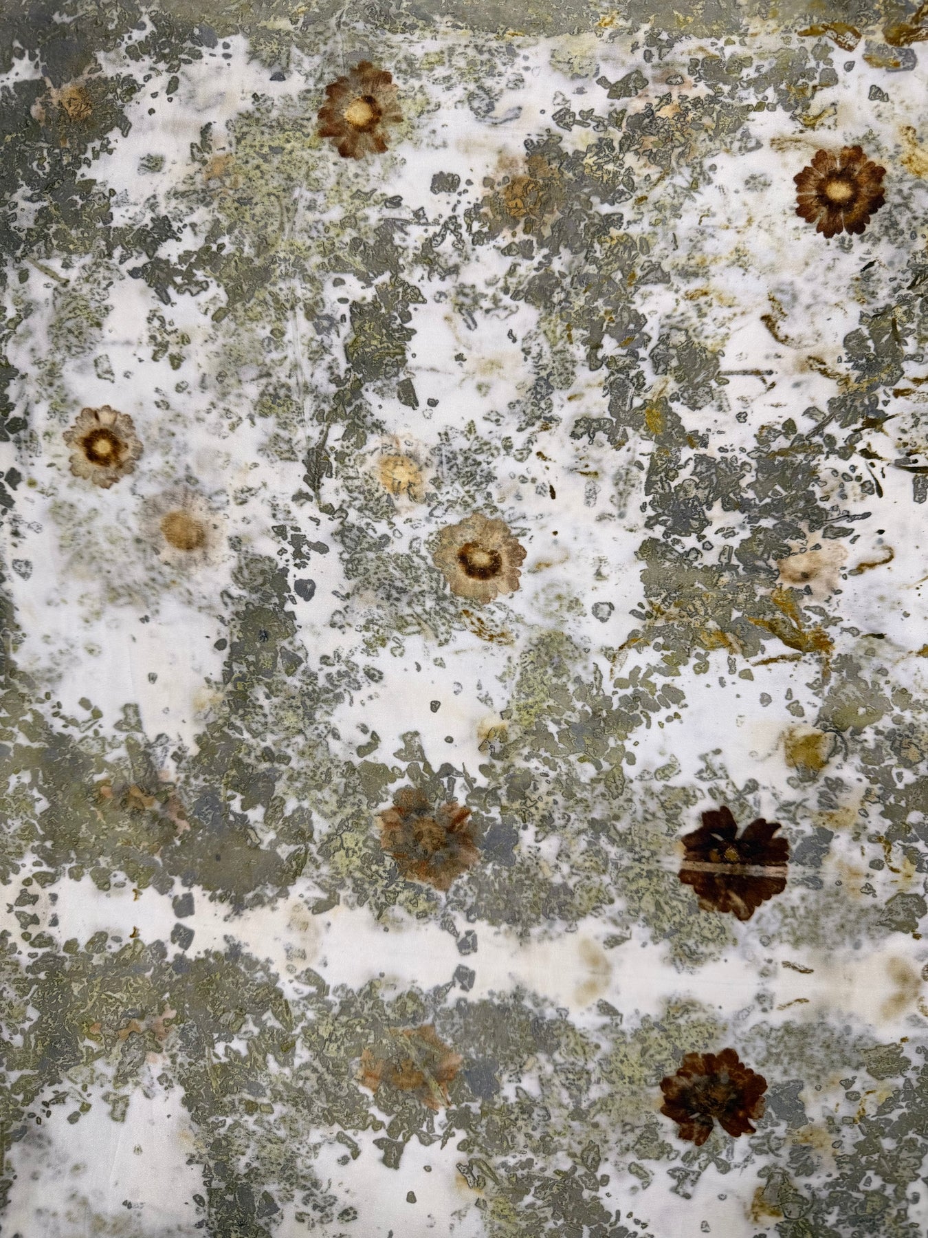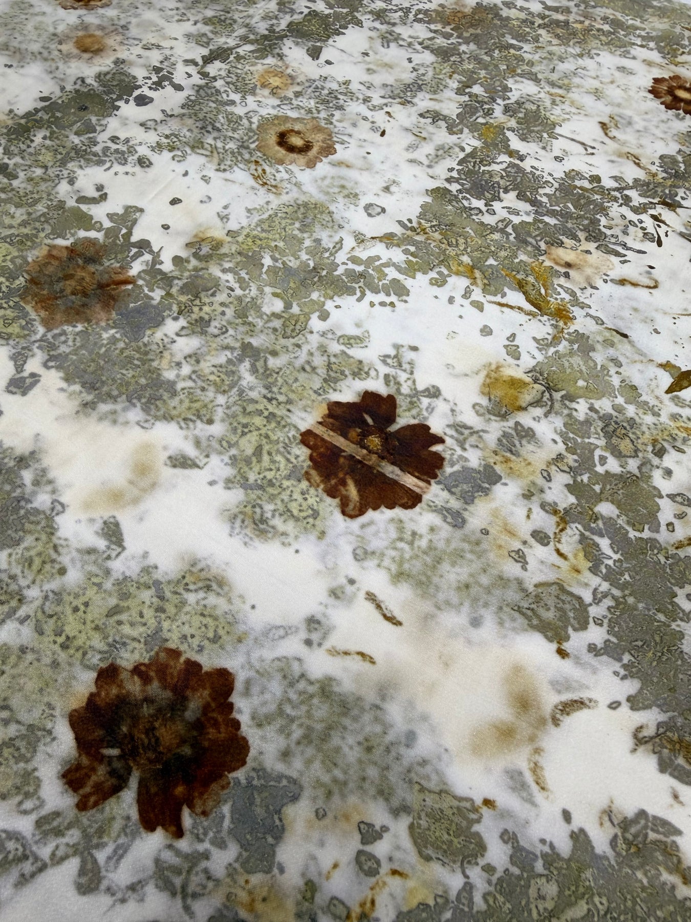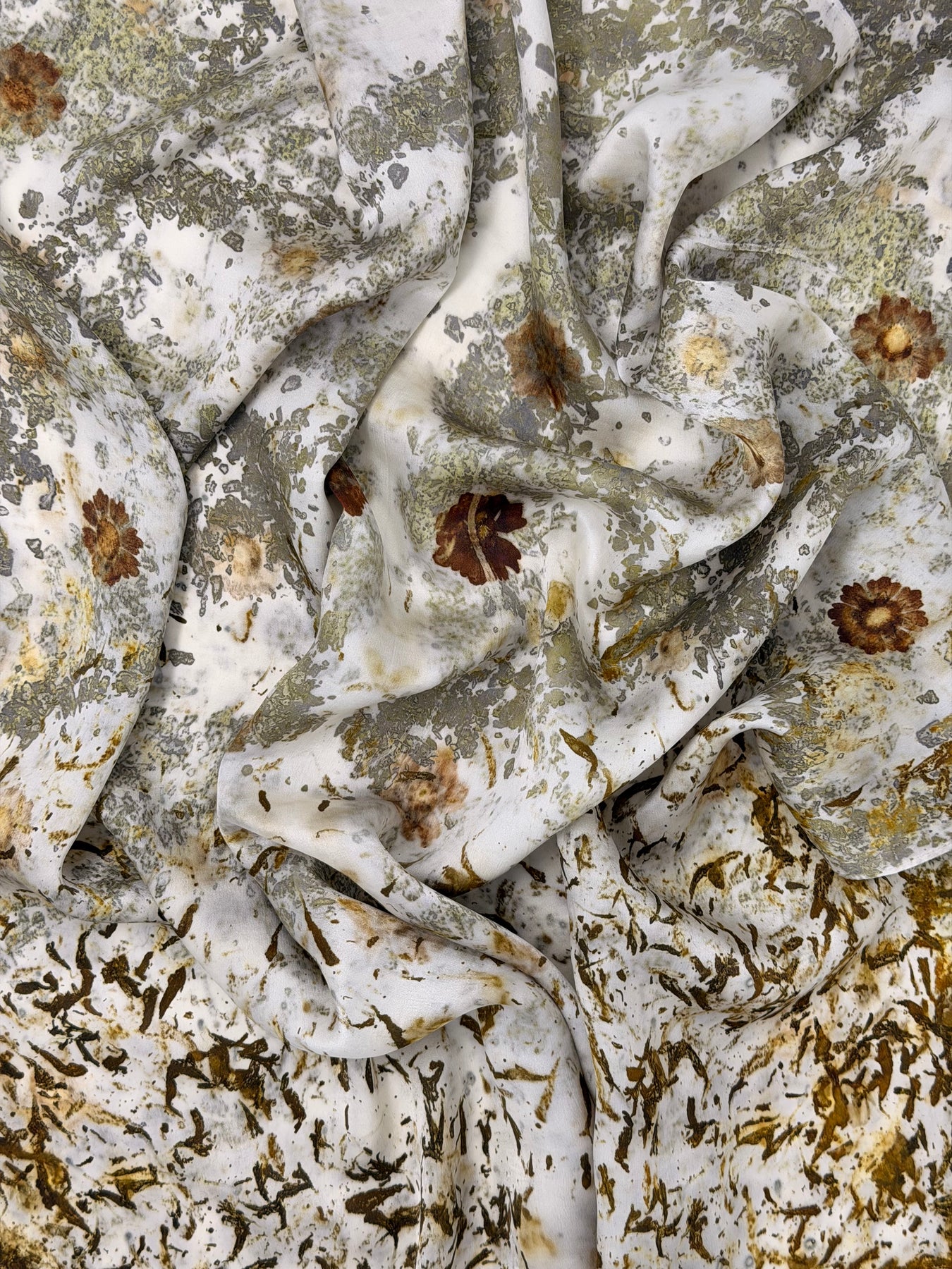 A one-of-a-kind Ecoprinted silk scarf from our Memora collection. Each piece is unique, made with botanical dyes to capture the beauty of nature in color and pattern.