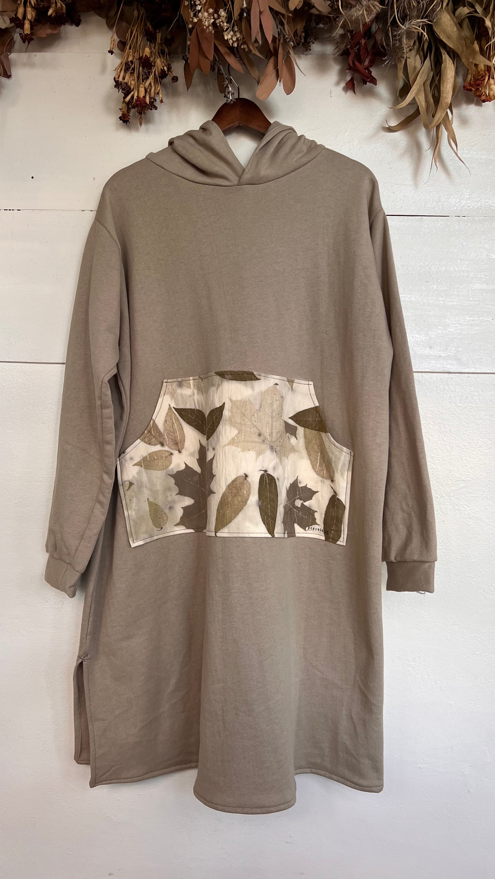 This limited edition hoodie features hand eco-printed pockets made with real leaves and flowers, carefully pressed onto natural fabric using a botanical printing process. Each pocket carries the unique imprint of Sweet Gum & Black Walnut, making every piece one of a kind.