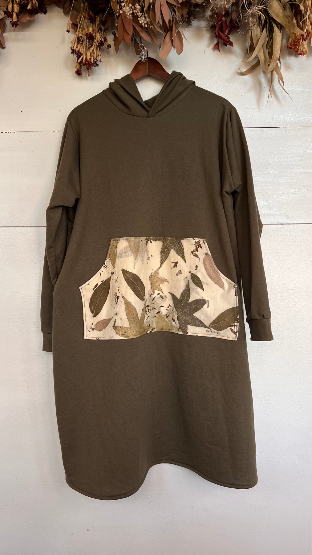 This limited edition hoodie features hand eco-printed pockets made with real leaves and flowers, carefully pressed onto natural fabric using a botanical printing process. Each pocket carries the unique imprint of Sweet Gum & Black Walnut, making every piece one of a kind.