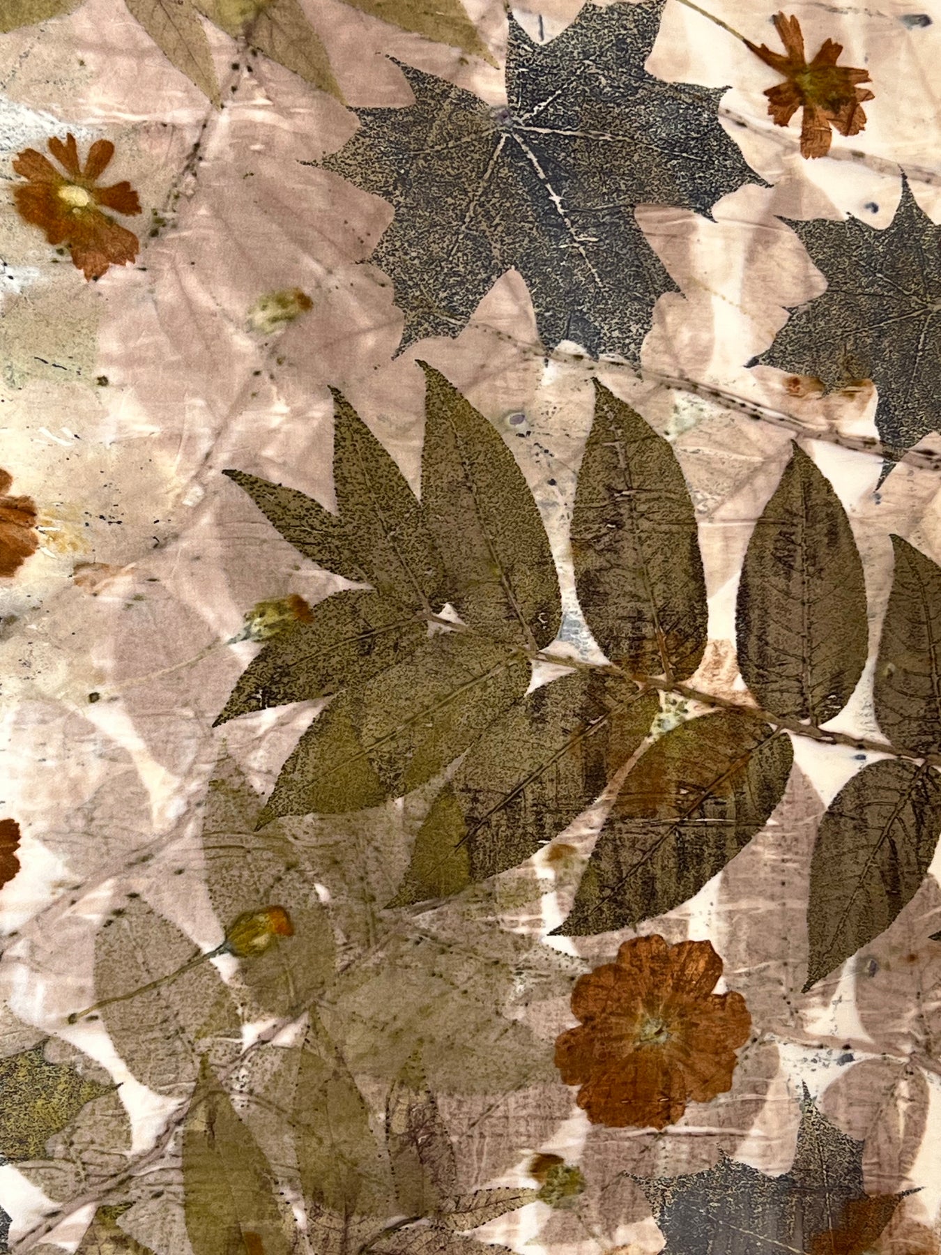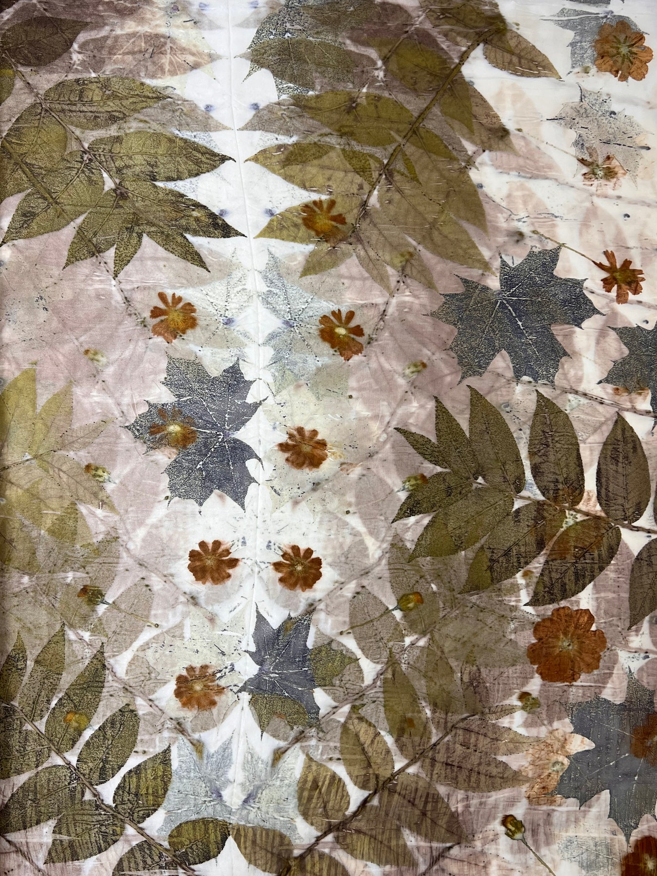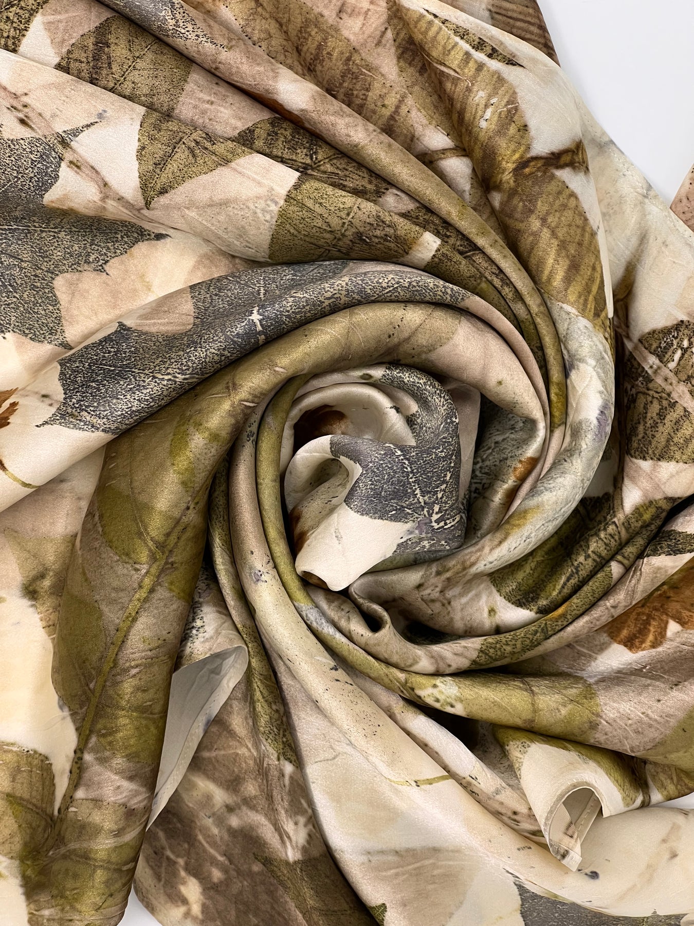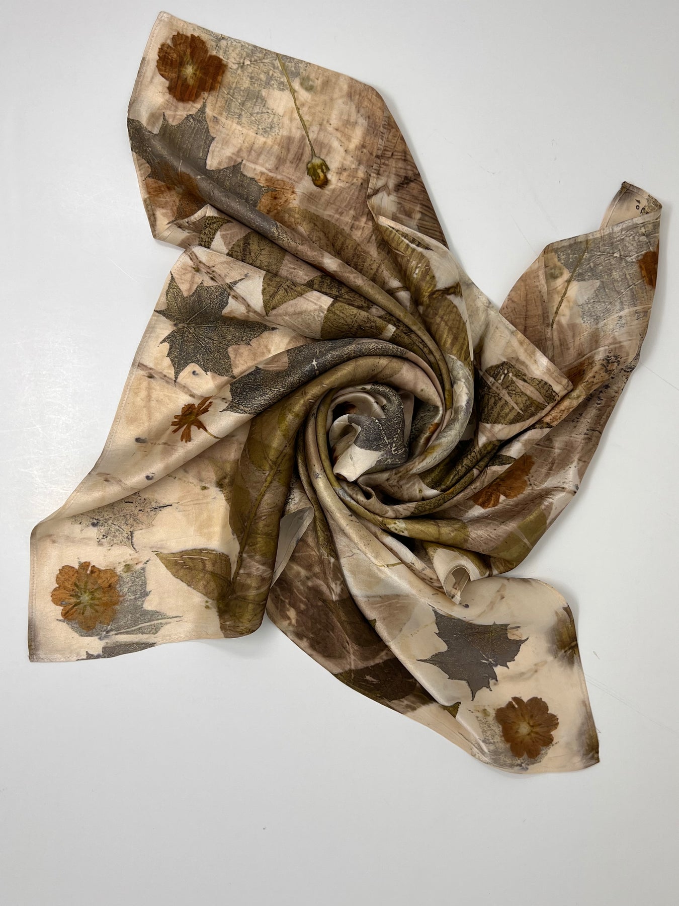 A one-of-a-kind Ecoprinted silk scarf from our Memora collection. Each piece is unique, made with botanical dyes to capture the beauty of nature in color and pattern.