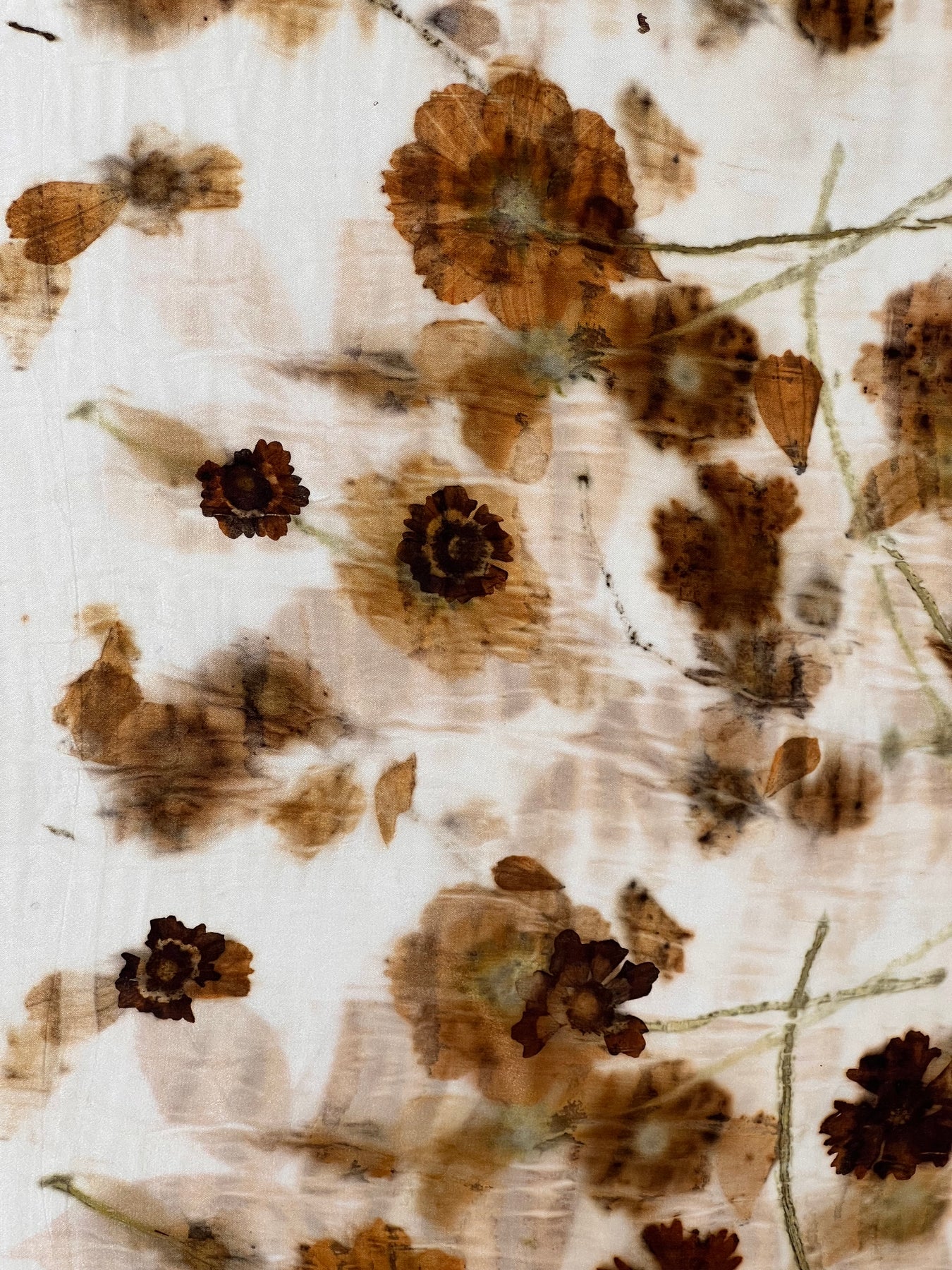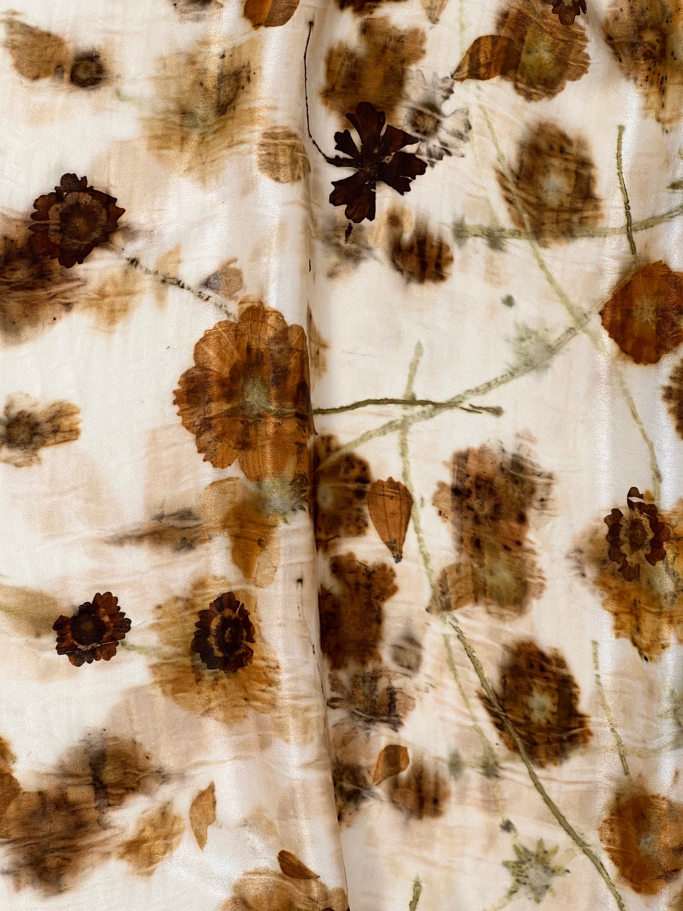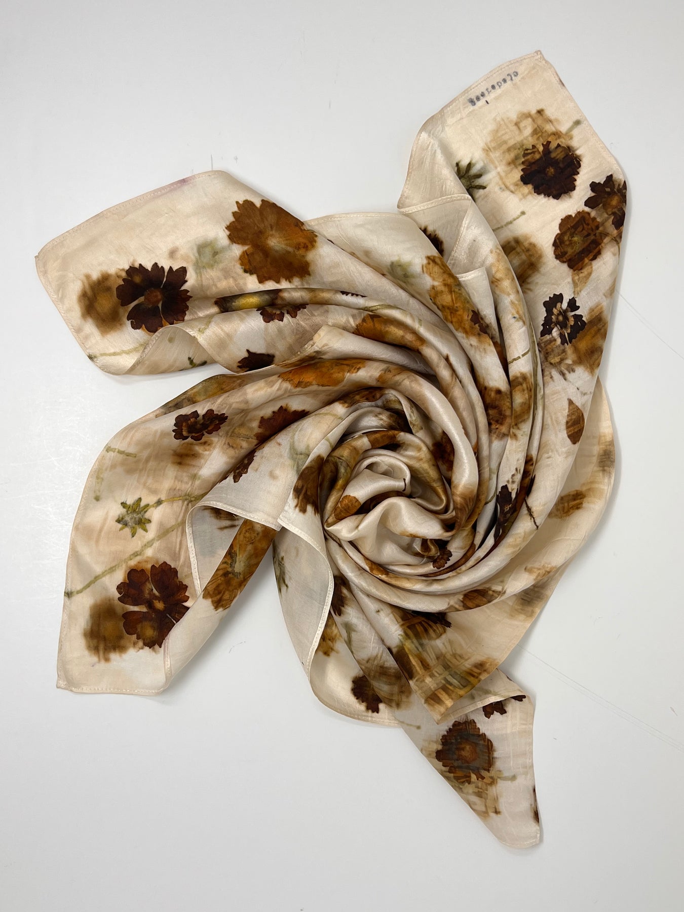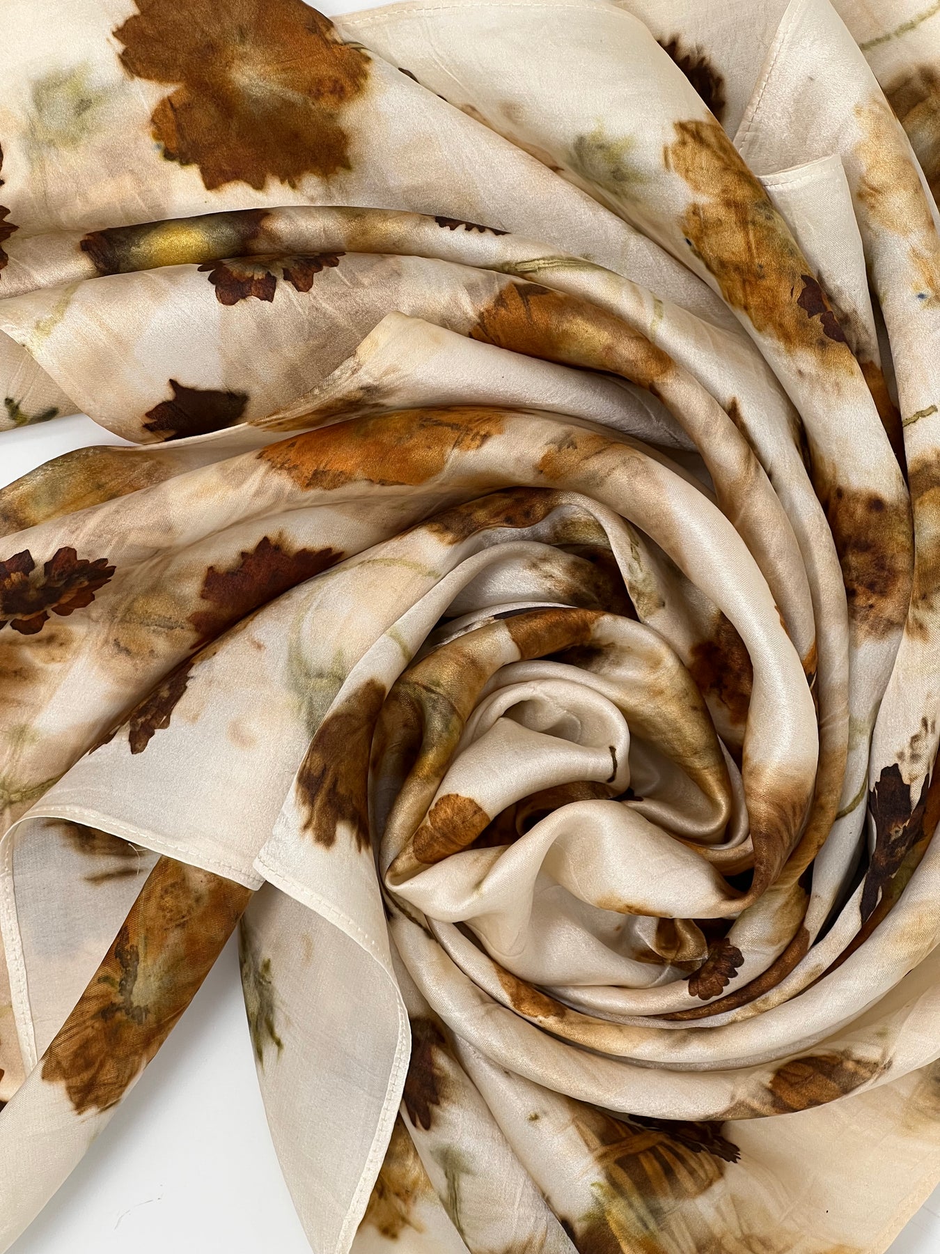 A one-of-a-kind Ecoprinted silk scarf from our Memora collection. Each piece is unique, made with botanical dyes to capture the beauty of nature in color and pattern.